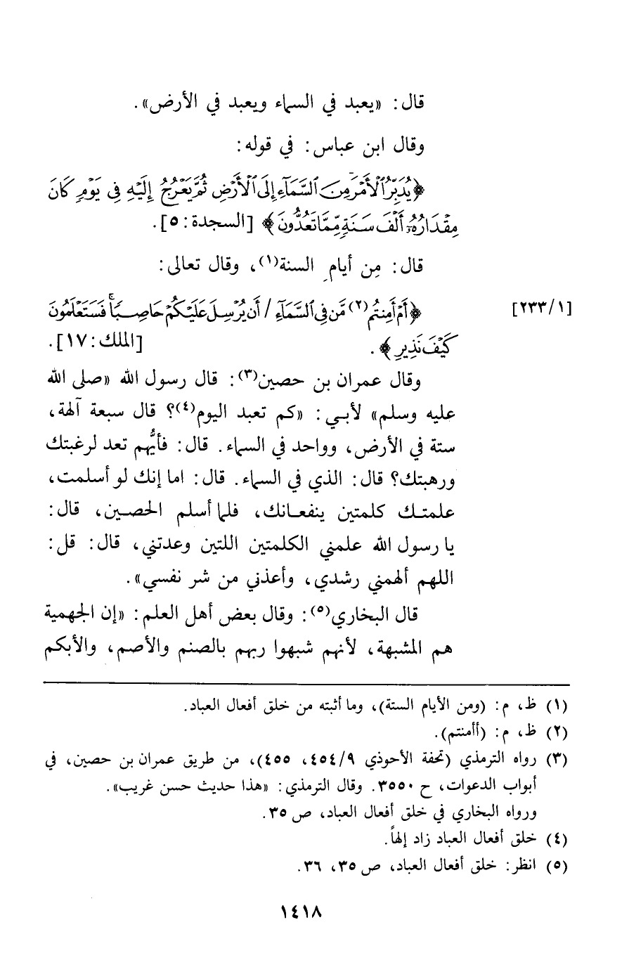 وقال ابن عباس في قوله {يُدَبِّرُ الْأَمْرَ مِنَ السَّمَاءِ إِلَى الْأَرْضِ ثُمَّ يَعْرُجُ إِلَيْهِ فِي يَوْمٍ كَانَ مِقْدَارُهُ أَلْفَ سَنَةٍ مِمَّا تَعُدُّونَ} [السجدة5] قال من أيام السنة وقال تعالى {أَمْ أَمِنْتُمْ مَنْ فِي السَّمَاءِ أَنْ يُرْسِلَ عَلَيْكُمْ حَاصِباً فَسَتَعْلَمُونَ كَيْفَ نَذِيرِ} [الملك17] وقال عمران بن حصين قال رسول الله صلى الله عليه وسلم لأبي: "كم تعبد اليوم قال سبعة آلهة ستة في الأرض وواحد في السماء قال فأيهم تعد لرغبتك ورهبتك قال الذي في السماء قال أما إنك لو أسلمت علمتك كلمتين ينفعانك فلما أسلم الحصين قال يا رسول الله صلى الله عليه وسلم علمني الكلمتين اللتين وعدتني قال قل اللهم ألهمني رشدي وأعذني من شر نفسي".