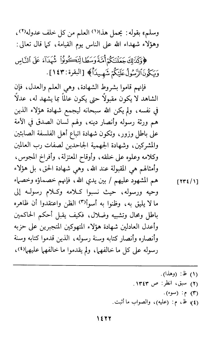 وسلم بقوله: " يحمل هذا العلم من كل خلف عدوله"، وهؤلاء شهداء الله على الناس يوم القيامة كما قال تعالى {وَكَذَلِكَ جَعَلْنَاكُمْ أُمَّةً وَسَطاً لِتَكُونُوا شُهَدَاءَ عَلَى النَّاسِ وَيَكُونَ الرَّسُولُ عَلَيْكُمْ شَهِيداً} [البقرة143] فإنهم قاموا بشروط الشهادة وهي العلم والعدل فإن الشاهد لا يكون مقبولا حتى يكون عالما بما يشهد له عدلا في نفسه ولم يكن الله سبحانه ليجمع شهادة هؤلاء الذين هم ورثة رسوله وأنصار دينه ولهم لسان الصدق في الأمة على باطل وزور وتكون شهادة اتباع أهل الفلسفة الصابئين والمشركين وشهادة الجهمية الجاحدين لصفات رب العالمين وكلامه وعلوه على خلقه وأوقاح المعتزلة وأفراخ المجوس وأمثالهم هي المقبولة عند الله وهي شهادة الحق بل هؤلاء هم المشهود عليهم بين يدي الله فإنهم خصماؤه وخصماء وحيه ورسوله حيث نسبوا كلامه وكلام رسوله إلى ما لا يليق به وظنوا به أسوأ الظن واعتقدوا أن ظاهره باطل ومحال وتشبيه وضلال فكيف يقبل أحكم الحاكمين وأعدل العادلين شهادة هؤلاء المتهوكين المتجبرين على حزبه وأنصاره وأنصار كتابه وسنة رسوله الذين قدموا كتابه وسنة رسوله على كل ما خالفهما ولم يقدموا ما خالفهما عليهما