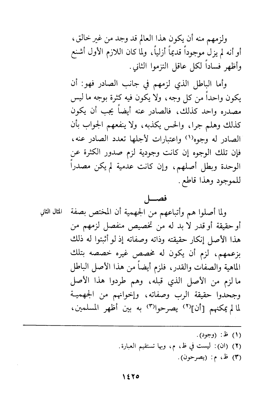 وأما الباطل الذي لزمهم في جانب الصادر فهو أن يكون واحدا من كل وجه ولا يكون فيه كثرة بوجه ما ليس مصدره واحد كذلك فالصادر عنه أيضا يجب أن يكون كذلك وهلم جرا والحس يكذبه ولا ينفعهم الجواب بأن الصادر له وجوه واعتبارات لأجلها تعدد الصادر عنه فإن تلك الوجوه إن كانت وجودية لزم صدور الكثرة عن الوحدة وبطل أصلهم وإن كانت عدمية لم يكن مصدرا للموجود وهذا قاطع.
