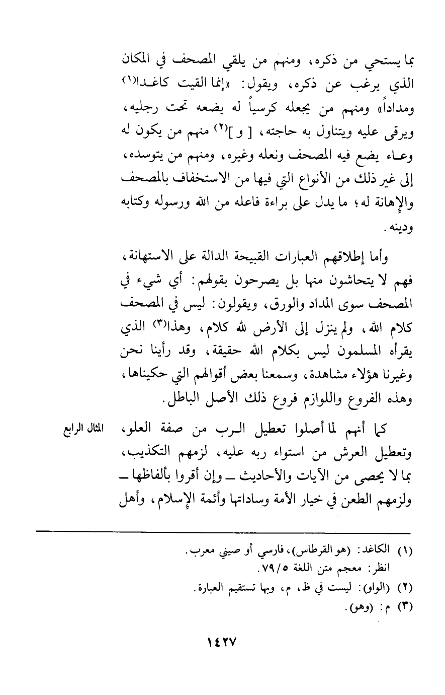 وأما إطلاقهم العبارات القبيحة الدالة على الاستهانة فهم لا يتحاشون منها بل يصرحون بقولهم أي شيء في المصحف سوى المداد والورق ويقولون ليس في المصحف كلام الله ولم ينزل إلى الأرض لله كلام وهذا الذي يقرأه المسلمون ليس بكلام الله حقيقة وقد رأينا نحن وغيرنا هؤلاء مشاهدة وسمعنا بعض أقوالهم التي حكيناها وهذه الفروع واللوازم فروع ذلك الأصل الباطل.