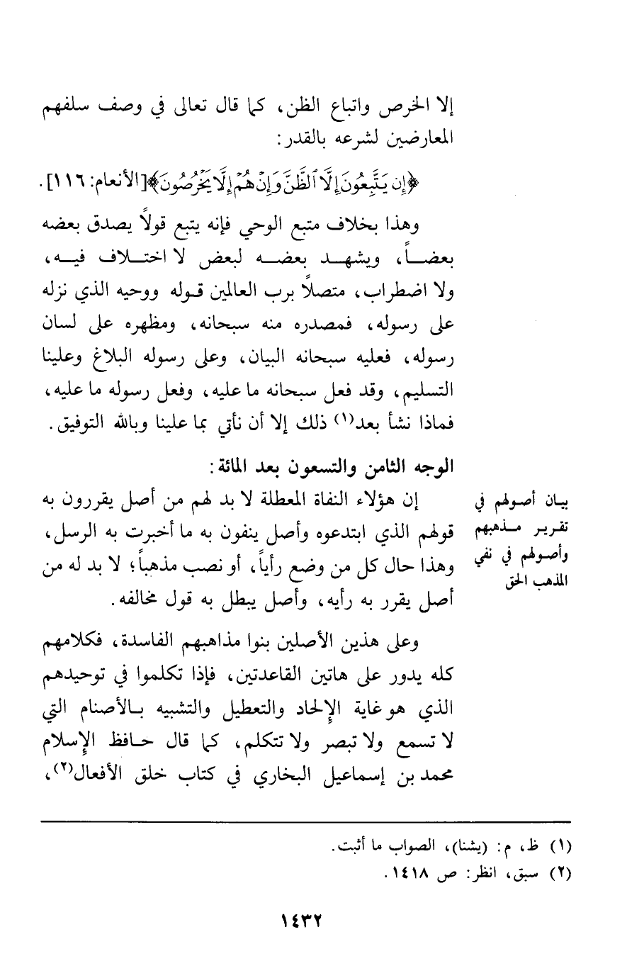 الوجه الثامن والتسعون بعد المائة: إن هؤلاء النفاة المعطلة لا بد لهم من أصل يقررون به قولهم الذي ابتدعوه وأصل ينفون به ما أخبرت به الرسل وهذا حال كل من وضع رأيا أو نصب مذهبا لا بد له من أصل يقرر به رأيه وأصل يبطل به قول مخالفه.