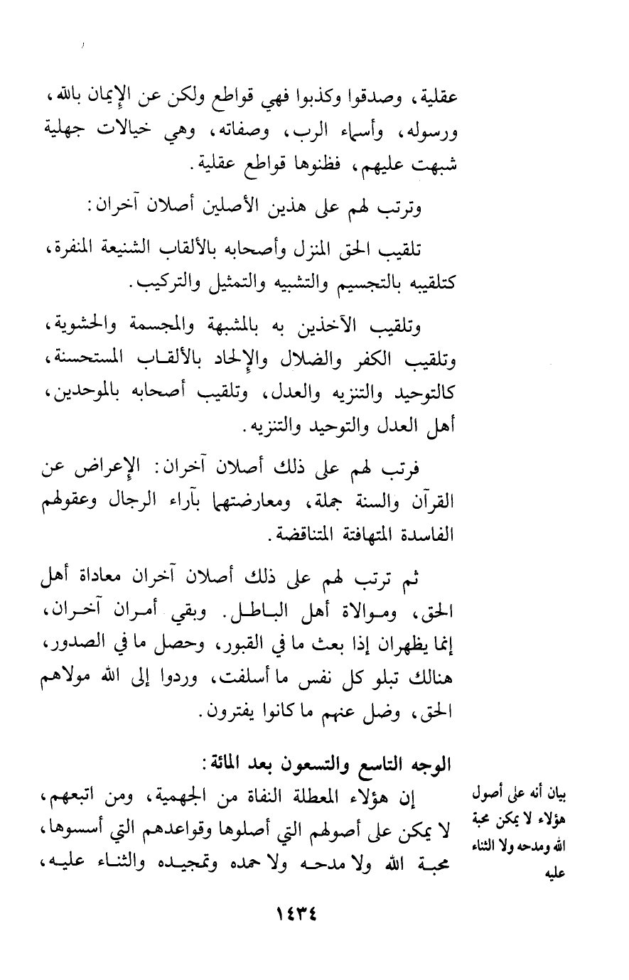 الوجه التاسع والتسعون بعد المائة: إن هؤلاء المعطلة النفاة من الجهمية ومن اتبعهم لا يمكن على أصولهم التي أصلوها وقواعدهم التي أسسوها محبة الله ولا مدحه ولا حمده وتمجيده والثناء عليه