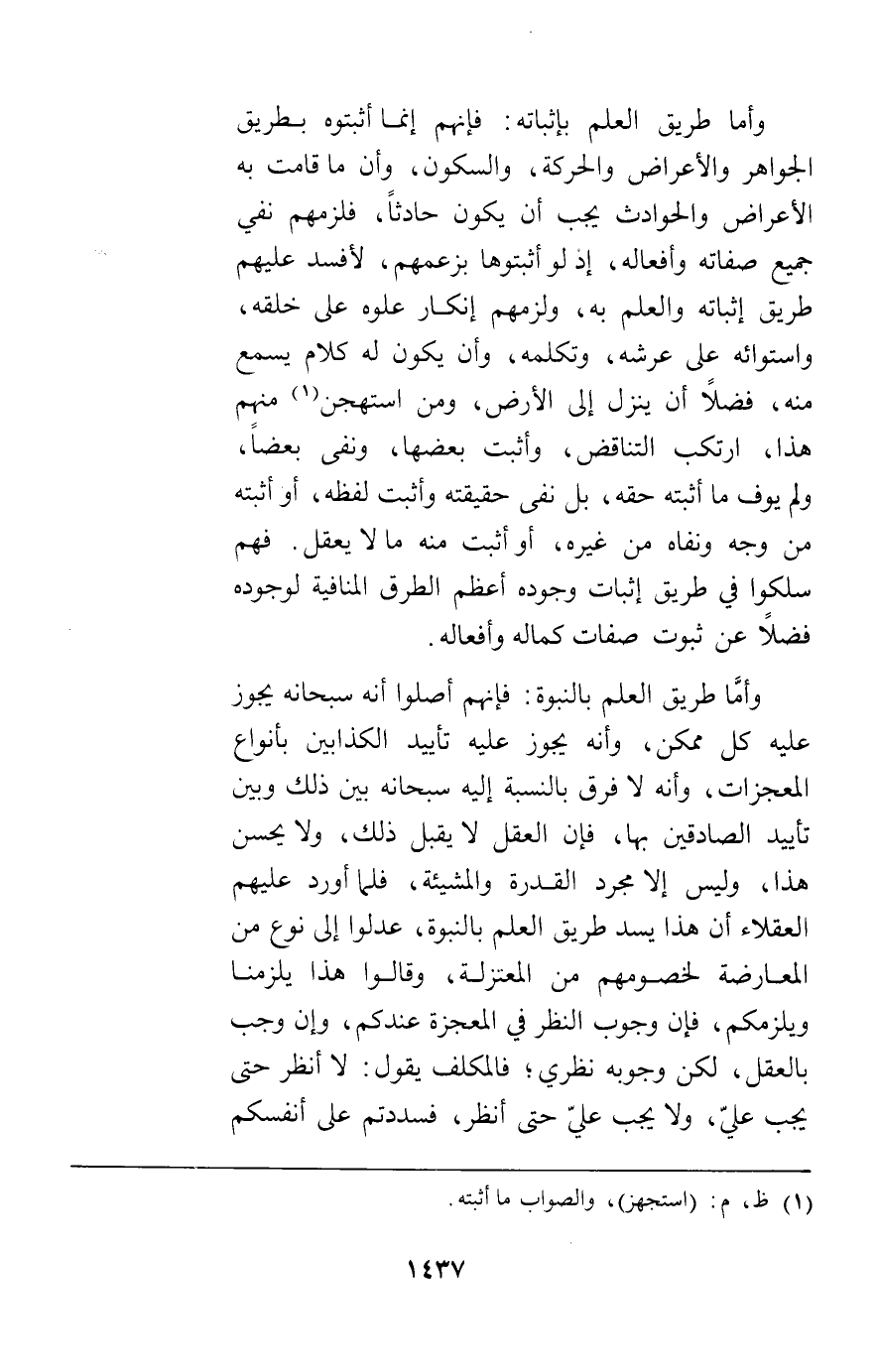 وأما طريق العلم بإثباته فإنهم إنما أثبتوه بطريق الجواهر والأعراض والحركة والسكون وأن ما قامت به الأعراض والحوادث يجب أن يكون حادثا فلزمهم نفي جميع صفاته وأفعاله إذ لو أثبتوها بزعمهم لأفسد عليهم طريق إثباته والعلم به ولزمهم إنكار علوه على خلقه واستوائه على عرشه وتكلمه وأن يكون له كلام يسمع منه فضلا أن ينزل إلى الأرض ومن استهجن منهم هذا ارتكب التناقض وأثبت بعضها ونفى بعضا ولم يوف ما أثبته حقه بل نفى حقيقته وأثبت لفظه أو أثبته من وجه ونفاه من غيره أو أثبت منه مالا يعقل فهم سلكوا في طريق إثبات وجوده أعظم الطرق المنافية لوجوده فضلا عن ثبوت صفات كماله وأفعاله.