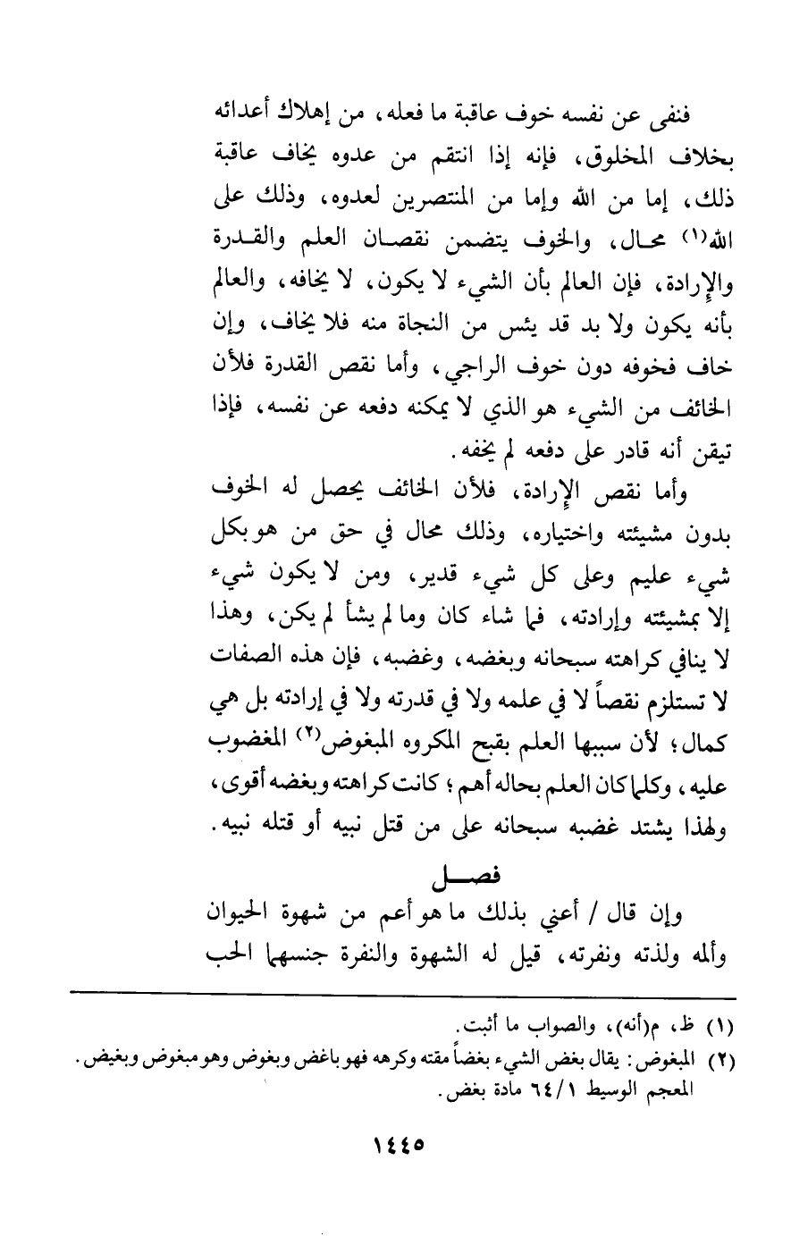 وأما نقص الإرادة فلأن الخائف يحصل له الخوف بدون مشيئته واختياره وذلك محال في حق من هو بكل شيء عليم وعلى كل شيء قدير ومن لا يكون شيء إلا بمشيئته وإرادته فما شاء كان وما لم يشأ لم يكن وهذا لا ينافي كراهته سبحانه وبغضه وغضبه فإن هذه الصفات لا تستلزم نقصا لا في علمه ولا في قدرته ولا في إرادته بل هي كمال لأن سببها العلم بقبح المكروه المبغوض المغضوب عليه وكلما كان العلم بحاله أهم كانت كراهته وبغضه أقوى ولهذا يشتد غضبه سبحانه على من قتل نبيه أو قتله نبيه.