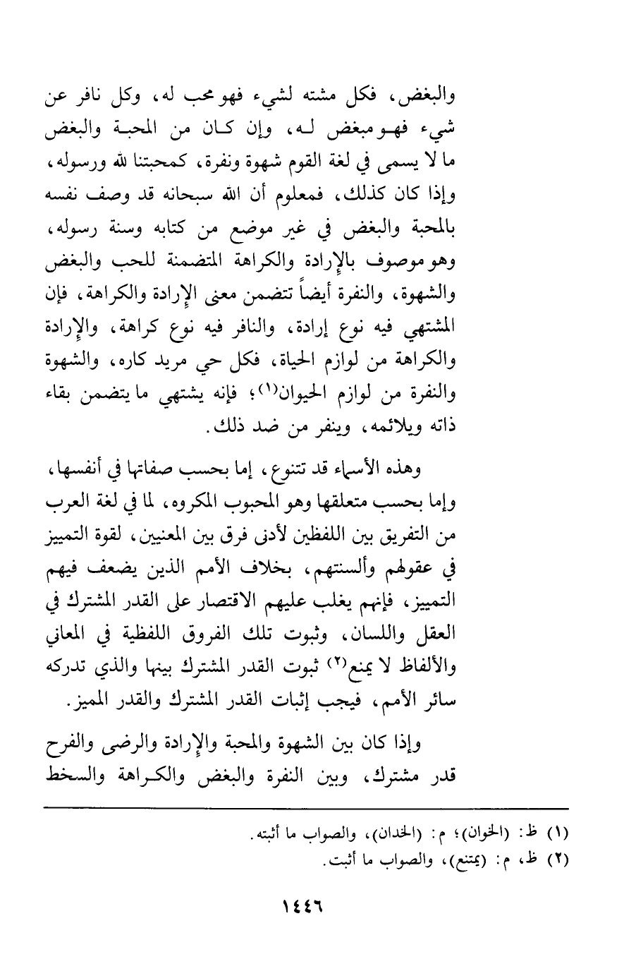 وهذه الأسماء قد تتنوع إما بحسب صفاتها في أنفسها وإما بحسب متعلقها وهو المحبوب المكروه لما في لغة العرب من التفريق بين اللفظين لأدنى فرق بين المعنيين لقوة التمييز في عقولهم وألسنتهم بخلاف الأمم الذين يضعف فيهم التمييز فإنهم يغلب عليهم الاقتصار على القدر المشترك في العقل واللسان وثبوت تلك الفروق اللفظية في المعاني والألفاظ لا يمنع ثبوت القدر المشترك بينها والذي تدركه سائر الأمم فيجب إثبات القدر المشترك والقدر المميز.