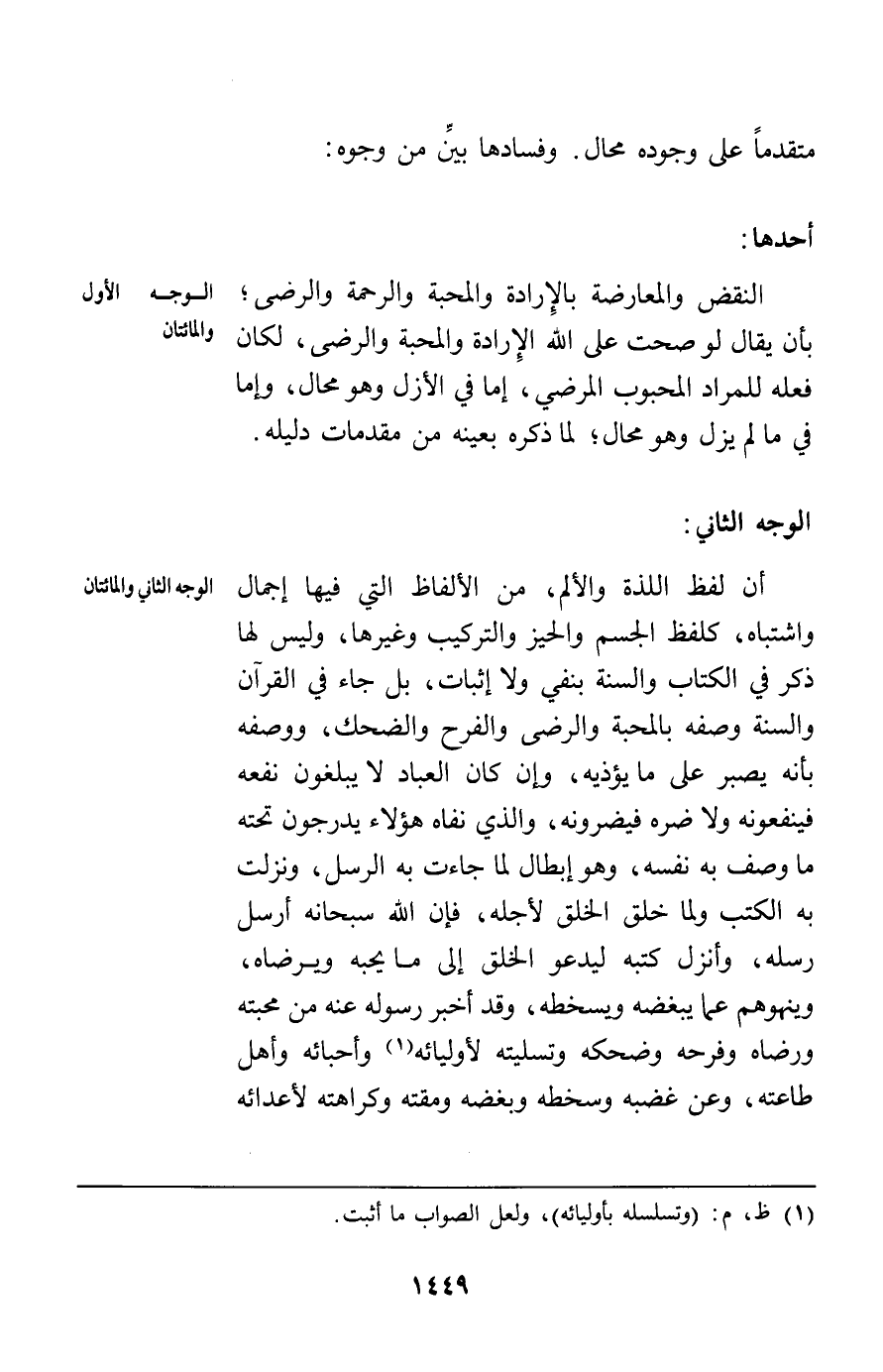 أحدها (الوجه الواحد والمائتان) النقض والمعارضة بالإرادة والمحبة والرحمة والرضى بأن يقال لو صحت على الله الإرادة والمحبة والرضى لكان فعله للمراد المحبوب المرضي إما في الأزل وهو محال وإما في مالم يزل وهو محال لما ذكره بعينه من مقدمات دليله.