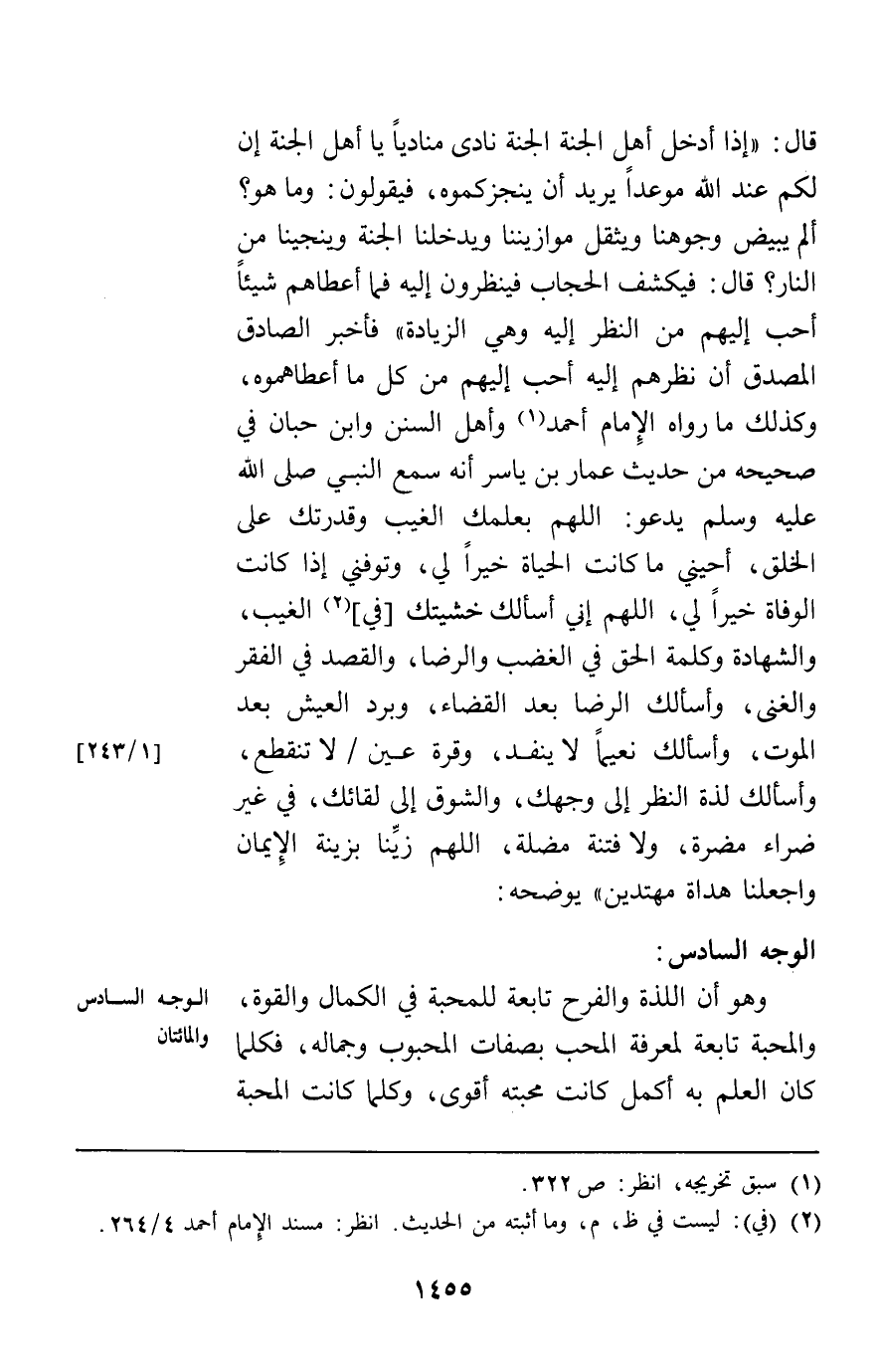 قال: "إذا أدخل أهل الجنة الجنة نادى مناد يا أهل الجنة إن لكم عند الله موعدا يريد أن ينجزكموه فيقولون وما هو ألم يبيض وجوهنا ويثقل موازيننا ويدخلنا الجنة وينجنا من النار قال فيكشف الحجاب فينظرون إليه فما أعطاهم شيئا أحب إليهم من النظر إليه وهي الزيادة" فأخبر الصادق المصدوق أن نظرهم إليه أحب إليهم من كل ما أعطاهموه وكذلك ما رواه الإمام أحمد وأهل السنن وابن حبان في صحيحه من حديث عمار بن ياسر أنه سمع النبي يدعو: " اللهم بعلمك الغيب وقدرتك على الخلق أحيني ما كانت الحياة خيرا لي وتوفني إذا كانت الوفاة خيرا لي اللهم إني أسألك خشيتك في الغيب والشهادة وكلمة الحق في الغضب والرضا والقصد في الفقر والغنى وأسألك الرضا بعد القضاء وبرد العيش بعد الموت وأسألك نعيما لا ينفد وقرة عين لا تنقطع وأسألك لذة النظر إلى وجهك والشوق إلى لقائك في غير ضراء مضرة ولا فتنة مضلة اللهم زينا بزينة الإيمان واجعلنا هداة مهتدين" يوضحه