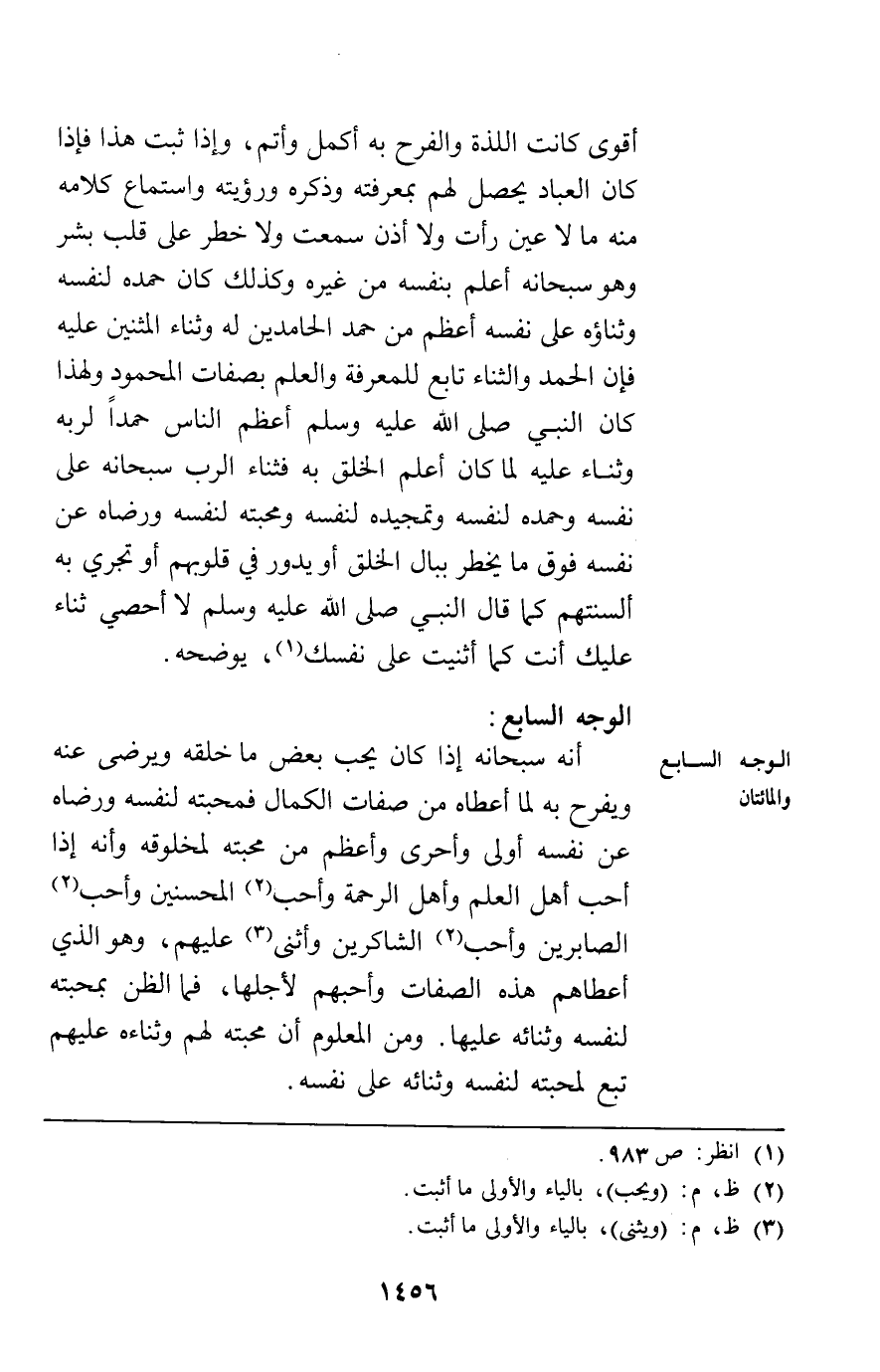 الوجه السابع والمائتان: أنه سبحانه إذا كان يحب بعض ما خلقه ويرضى عنه ويفرح به لما أعطاه من صفات الكمال فمحبته لنفسه ورضاه عن نفسه أولى وأحرى وأعظم من محبته لمخلوقه وأنه إذا أحب أهل العلم وأهل الرحمة وأحب المحسنين وأحب الصابرين وأحب الشاكرين وأثنى عليهم وهو الذي أعطاهم هذه الصفات وأحبهم لأجلها فما الظن بمحبته لنفسه وثنائه عليها ومن المعلوم أن محبته لهم وثناءه عليهم تبع لمحبته لنفسه وثنائه على نفسه.