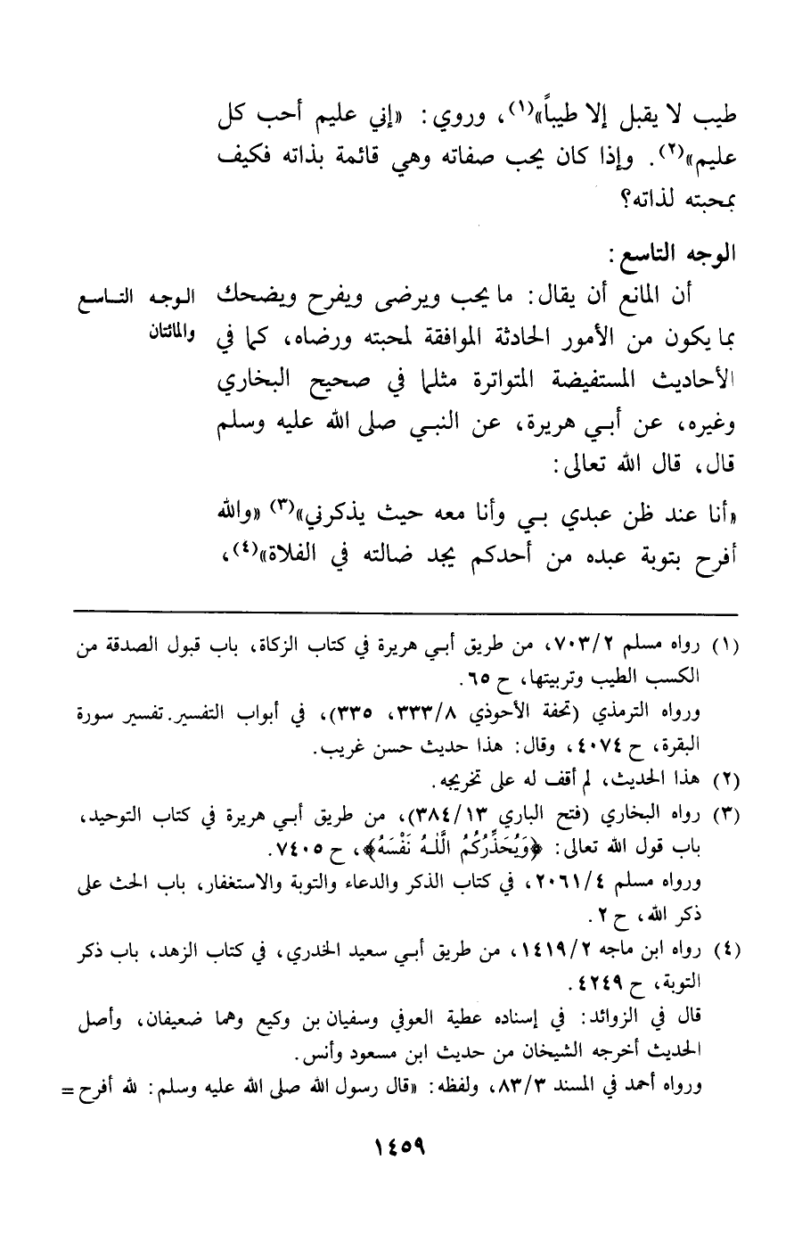 الوجه التاسع والمائتان: أن يقال ما المانع أن يحب ويرضى ويفرح ويضحك بما يكون من الأمور الحادثة الموافقة لمحبته ورضاه كما في الأحاديث المستفيضة المتواترة مثلما في صحيح البخاري وغيره عن أبي هريرة عن النبي صلى الله عليه وسلم قال: "قال الله تعالى أنا عند ظن عبدي بي"، "وأنا معه حيث يذكرني والله أفرح بتوبة عبده من أحدكم يجد ضالته في الفلاة"