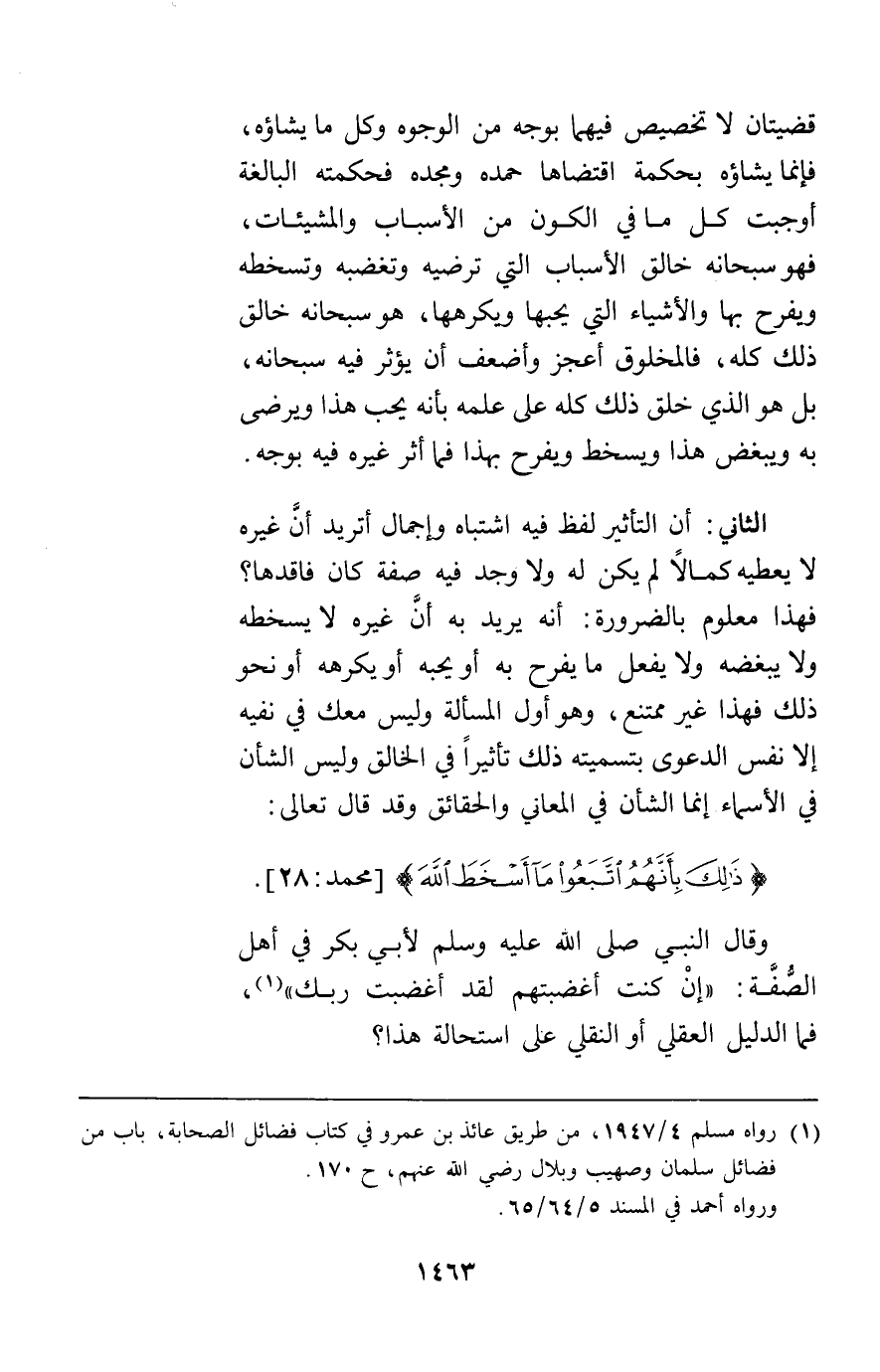 الثاني: أن التأثير لفظ فيه اشتباه وإجمال أتريد أن غيره يعطيه كمالا لم يكن له ولا وجد فيه صفة كان فاقدها فهذا معلوم بالضرورة أنه يريد به أن غيره لا يسخطه ولا يبغضه ولا يفعل ما يفرح به أو يحبه أو يكرهه أو نحو ذلك فهذا غير ممتنع وهو أول المسألة وليس معك في نفيه إلا نفس الدعوى بتسمية ذلك تأثيرا في الخالق وليس الشأن في الأسماء إنما الشأن في المعاني والحقائق وقد قال تعالى {ذَلِكَ بِأَنَّهُمُ اتَّبَعُوا مَا أَسْخَطَ اللَّهَ} [محمد28] وقال النبي صلى الله عليه وسلم لأبي بكر في أهل الصفة: "إن كنت أغضبتهم لقد أغضبت ربك" فما الدليل العقلي أو النقلي على استحالة هذا