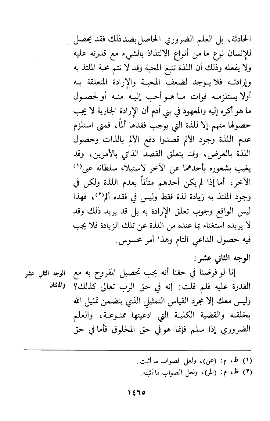 الوجه الثاني عشر والمائتان: إنا لو فرضنا في حقنا أنه يجب تحصيل المفروح به مع القدرة عليه فلم قلت إنه في حق الرب تعالى كذلك? وليس معك إلا مجرد القياس التمثيلي الذي يتضمن تمثيل الله بخلقه والقضية الكلية التي ادعيتها ممنوعة والعلم الضروري إذا سلم فإنما هو في حق المخلوق فأما في حق