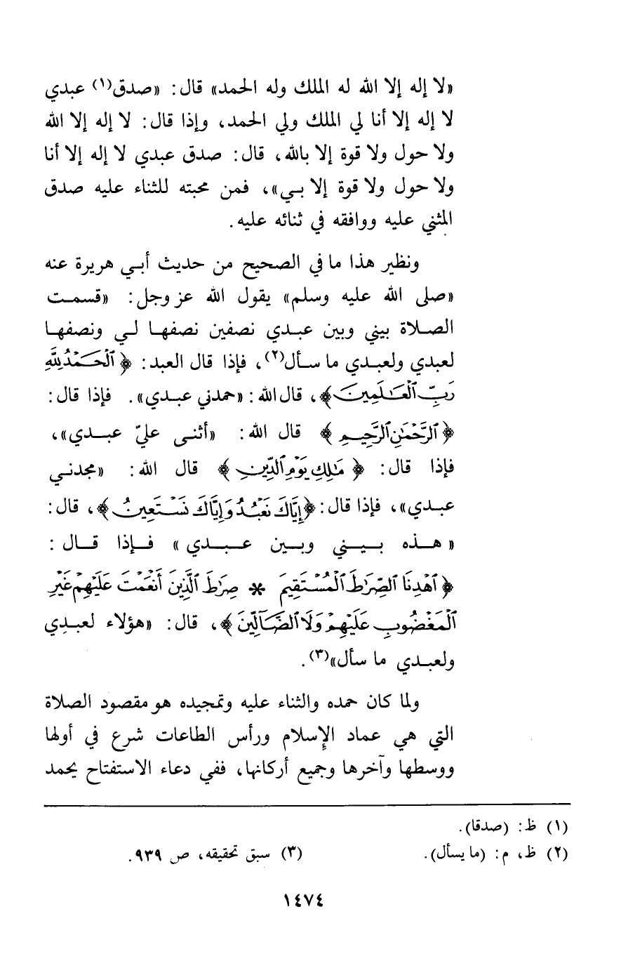 ونظير هذا ما في الصحيح من حديث أبي هريرة عنه "يقول الله عز وجل قسمت الصلاة بيني وبين عبدي نصفين نصفها لي ونصفها لعبدي ولعبدي ما سأل فإذا قال العبد {الْحَمْدُ لِلَّهِ رَبِّ الْعَالَمِينَ} قال الله حمدني عبدي فإذا قال {الرَّحْمَنِ الرَّحِيمِ} قال الله أثنى علي عبدي فإذا قال {مَالِكِ يَوْمِ الدِّينِ} قال الله مجدني عبدي فإذا قال {إِيَّاكَ نَعْبُدُ وَإِيَّاكَ نَسْتَعِينُ} قال هذه بيني وبين عبدي فإذا قال {اهْدِنَا الصِّرَاطَ الْمُسْتَقِيمَ صِرَاطَ الَّذِينَ أَنْعَمْتَ عَلَيْهِمْ غَيْرِ الْمَغْضُوبِ عَلَيْهِمْ وَلا الضَّالِّينَ} قال هؤلاء لعبدي ولعبدي ما سأل".