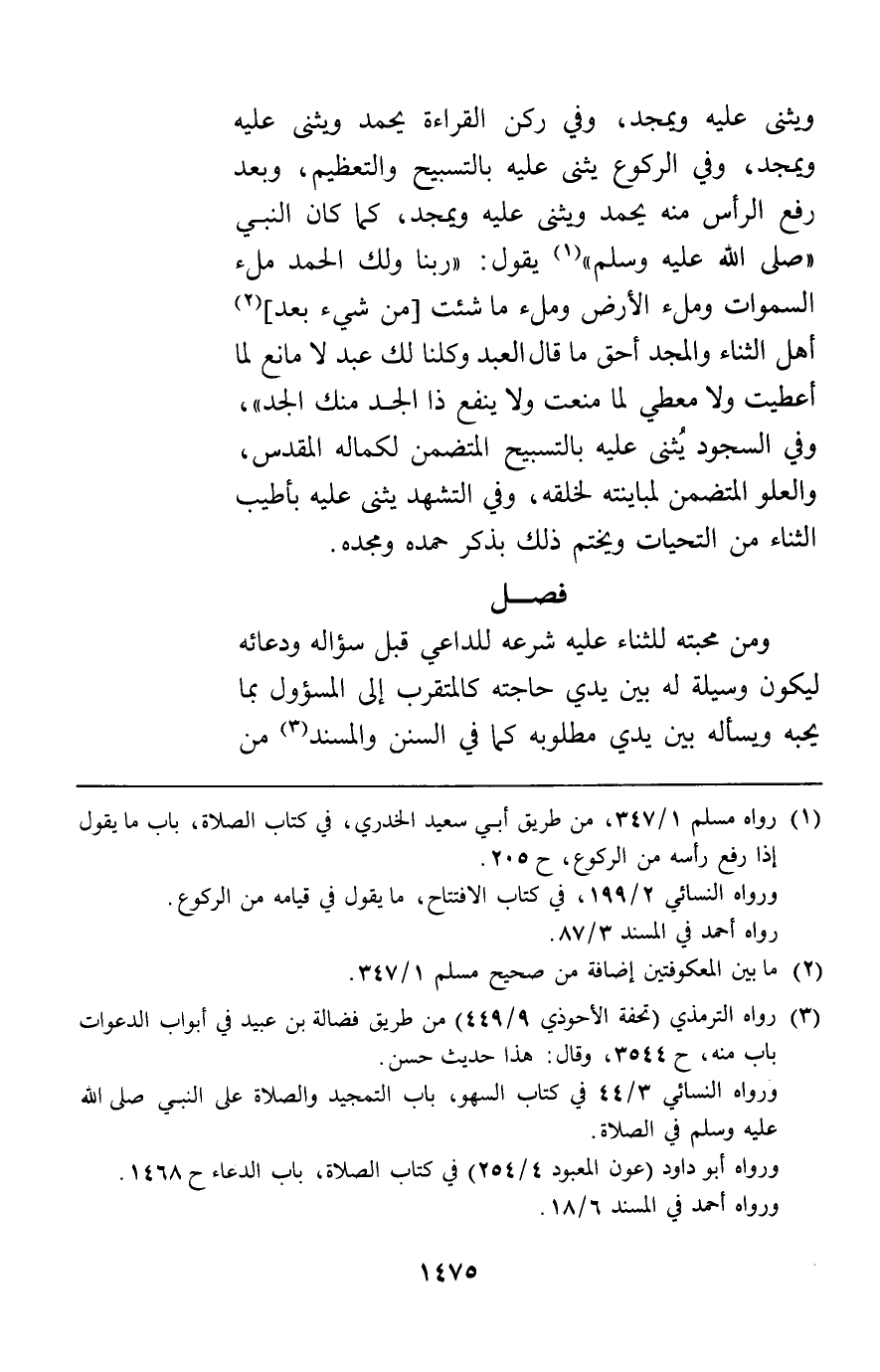 ويثنى عليه ويمجد وفي ركن القراءة يحمد ويثنى عليه ويمجد وفي الركوع يثنى عليه بالتسبيح والتعظيم وبعد رفع الرأس منه يحمد ويثنى عليه ويمجد كما كان النبي صلى الله عليه وسلم يقول: "ربنا ولك الحمد ملء السموات وملء الأرض وملء ما شئت من شيء بعد أهل الثناء والمجد أحق ما قال العبد وكلنا لك عبد لا مانع لما أعطيت ولا معطي لما منعت ولا ينفع ذا الجد منك الجد" وفي السجود يثنى عليه بالتسبيح المتضمن لكماله المقدس والعلو المتضمن لمباينته لخلقه وفي التشهد يثنى عليه بأطيب الثناء من التحيات ويختم ذلك بذكر حمده ومجده.