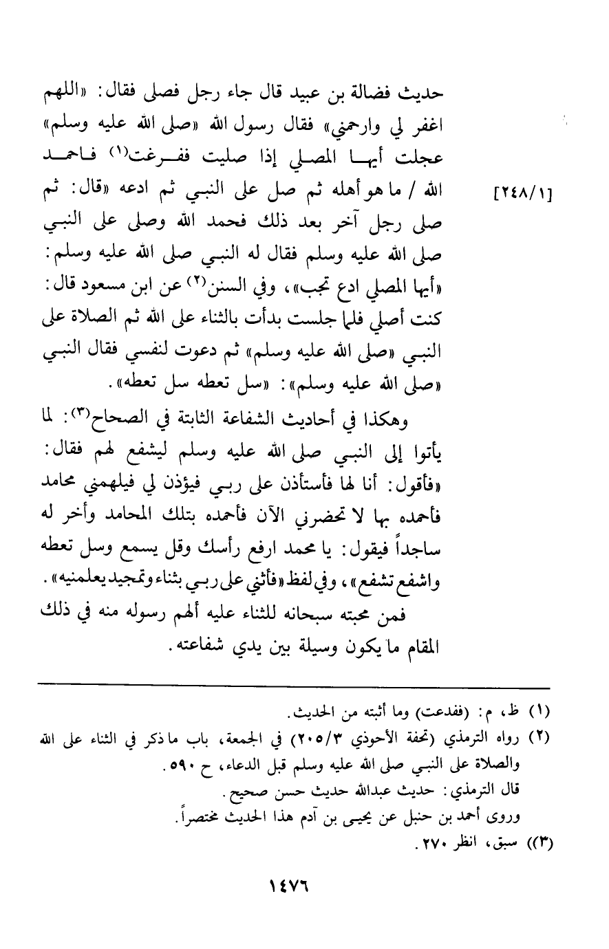 وهكذا في أحاديث الشفاعة الثابتة في الصحاح لما يأتوا إلى النبي صلى الله عليه وسلم ليشفع لهم فقال: "فأقول أنا لها فأستأذن على ربي فيؤذن لي فيلهمني محامد فأحمده بها لا تحضرني الآن فأحمده بتلك المحامد وأخر له ساجدا فيقول يا محمد ارفع رأسك وقل يسمع وسل تعطه واشفع تشفع" وفي لفظ فأثني على ربي بثناء وتمجيد يعلمنيه فمن محبته سبحانه للثناء عليه ألهم رسوله منه في ذلك المقام ما يكون وسيلة بين يدي شفاعته.