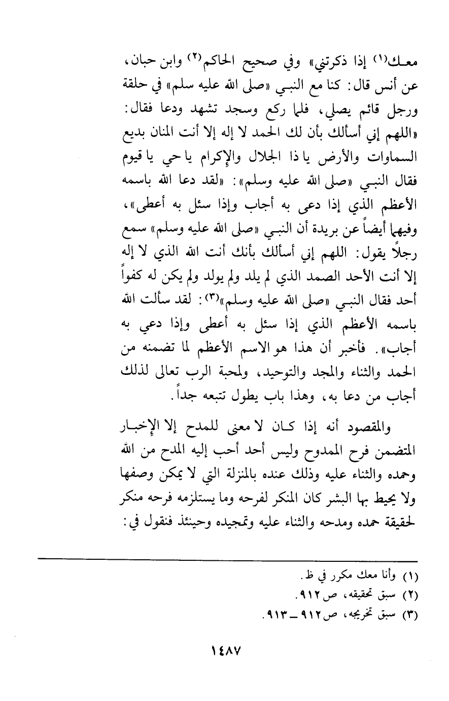 معك إذا ذكرتني وفي صحيح الحاكم ابن حبان عن أنس قال كنا مع النبي صلى الله عليه وسلم في حلقة ورجل قائم يصلي فلما ركع وسجد تشهد ودعا فقال اللهم إني أسألك بأن لك الحمد لا إله إلا أنت المنان بديع السماوات والأرض يا ذا الجلال والإكرام يا حي يا قيوم فقال النبي صلى الله عليه وسلم: "لقد دعا الله باسمه الأعظم الذي إذا دعى به أجاب وإذا سئل به أعطى" وفيهما أيضا عن بريدة أن النبي سمع رجلا يقول اللهم إني أسألك بأنك أنت الله الذي لا إله إلا أنت الأحد الصمد الذي لم يلد ولم يولد ولم يكن له كفوا أحد فقال النبي صلى الله عليه وسلم: "لقد سألت الله باسمه الأعظم الذي إذا سئل به أعطى وإذا دعي به أجاب" فأخبر أن هذا هو الاسم الأعظم لما تضمنه من الحمد والثناء والمجد والتوحيد ولمحبة الرب تعالى لذلك أجاب من دعا به وهذا باب يطول تتبعه جدا.