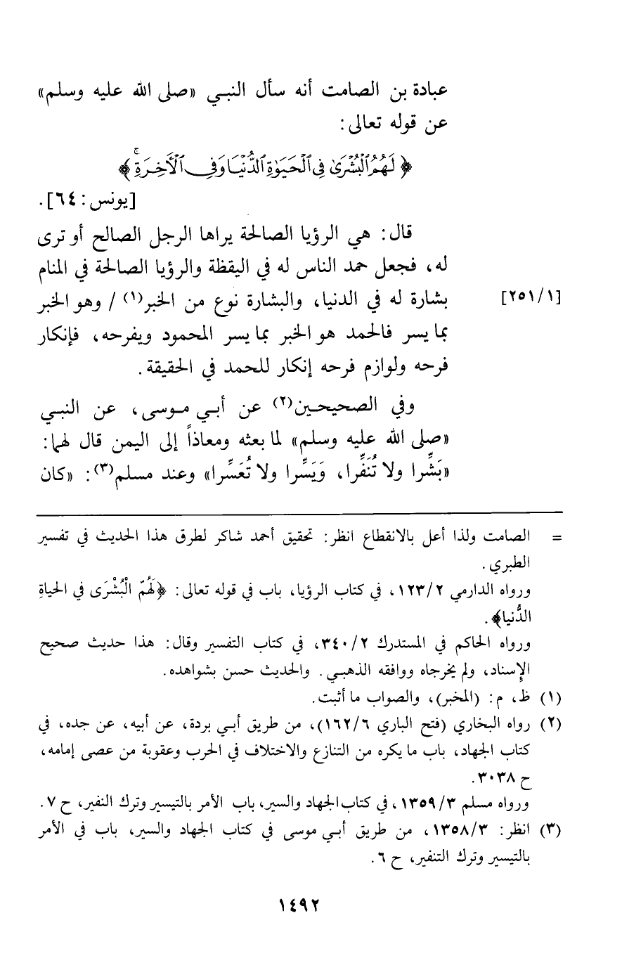 عبادة بن الصامت أنه سأل النبي عن قوله تعالى {لَهُمُ الْبُشْرَى فِي الْحَيَاةِ الدُّنْيَا وَفِي الآخِرَةِ} [يونس 64] قال هي الرؤيا الصالحة يراها الرجل الصالح أو ترى له فجعل حمد الناس له في اليقظة والرؤيا الصالحة في المنام بشارة له في الدنيا والبشارة نوع من الخبر وهو الخبر بما يسر فالحمد هو الخبر بما يسر المحمود ويفرحه فإنكار فرحه ولوازم فرحه إنكار للحمد في الحقيقة.