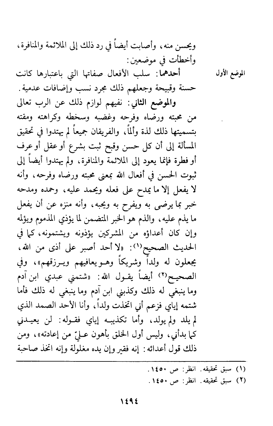 والموضع الثاني نفيهم لوازم ذلك عن الرب تعالى من محبته ورضاه وفرحه وغضبه وسخطه وكراهته ومقته بتسميتها ذلك لذة وألما والفريقان جميا لم يهتدوا في تحقيق المسألة إلى أن كل حسن وقبح ثبت بشرع أو عقل أو عرف أو فطرة فإنما يعود إلى الملائمة والمنافرة ولم يهتدوا أيضا إلى ثبوت الحسن في أفعال الله بمعنى محبته ورضاه وفرحه وأنه لا يفعل إلا ما يمدح على فعله ويحمد عليه وحمده ومدحه خبر بما يرضى به ويفرح به ويحبه وأنه منزه عن أن يفعل ما يذم عليه والذم هو الخبر المتضمن لما يؤذي المذموم ويؤلمه وإن كان أعداؤه من المشركين يؤذونه ويشتمونه كما في الحديث الصحيح لا أحد أصبر على أذى من الله يجعلون له ولدا وشريكا وهو يعافيهم ويرزقهم في الصحيح أيضا يقول الله شتمني عبدي ابن آدم وما ينبغي له ذلك وكذبني ابن آدم وما ينبغي له ذلك فأما شتمه إياي فزعم أني اتخذت ولدا وأنا الأحد الصمد الذي لم يلد ولم يولد وأما تكذيبه إياي فقوله لن يعيدني كما بدأني وليس أول الخلق بأهون علي من إعادته ومن ذلك قول أعدائه إنه فقير وإن يده مغلولة وإنه اتخذ صاحبة