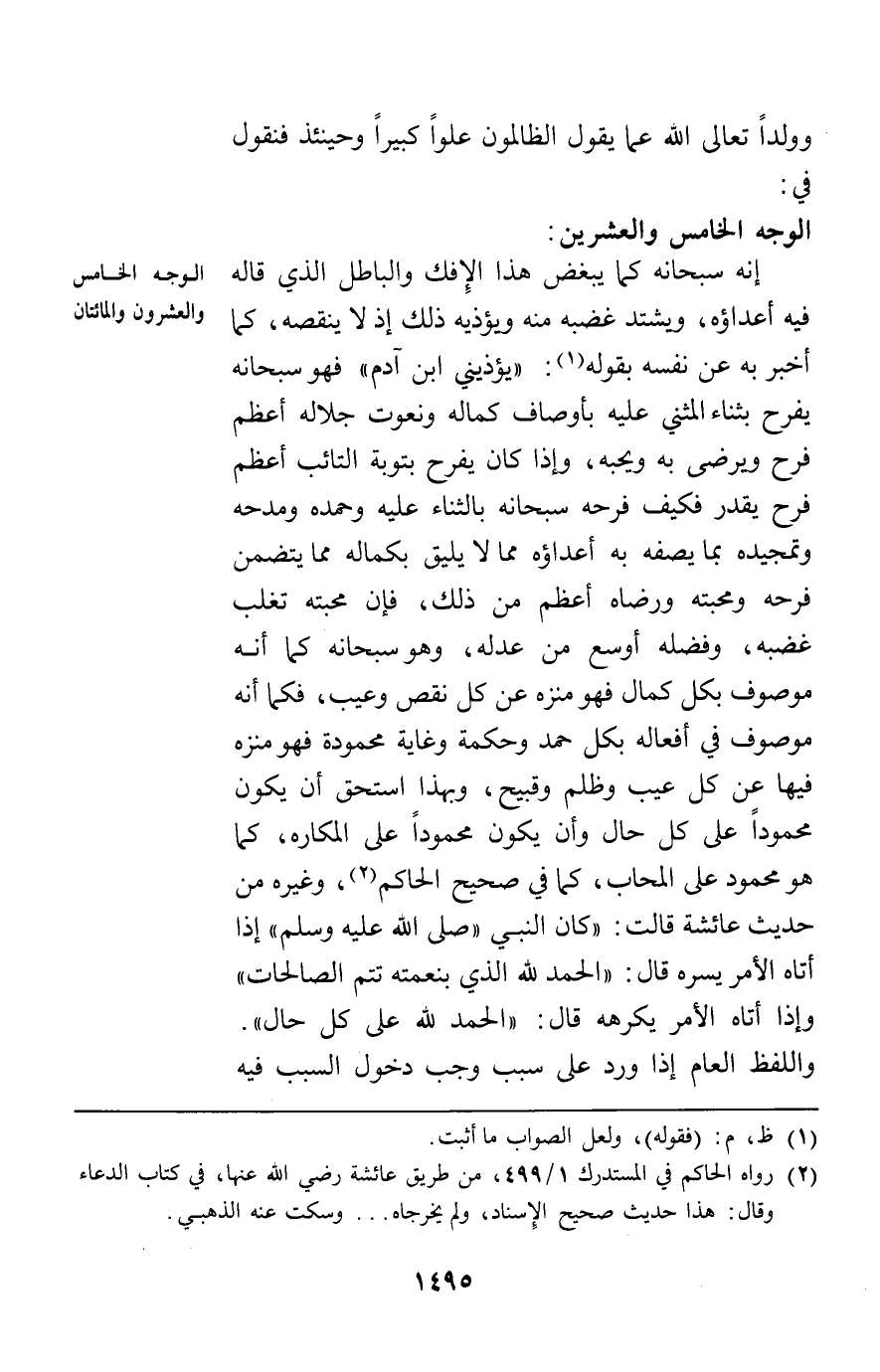 الوجه الخامس والعشرين والمائتان: إنه سبحانه كما يبغض هذا الإفك والباطل الذي قاله فيه أعداؤه ويشتد غضبه منه ويؤذيه ذلك إذ لا ينقصه كما أخبر به عن نفسه بقوله "يؤذيني ابن آدم" فهو سبحانه يفرح بثناء المثني عليه بأوصاف كماله ونعوت جلاله أعظم فرح ويرضى به ويحبه وإذا كان يفرح بتوبة التائب أعظم فرح يقدر فكيف فرحه سبحانه بالثناء عليه وحمده ومدحه وتمجيده بما يصفه به أعداؤه مما لا يليق بكماله مما يتضمن فرحه ومحبته ورضاه أعظم من ذلك فإن محبته تغلب غضبه وفضله أوسع من عدله وهو سبحانه كما أنه موصوف بكل كمال فهو منزه عن كل نقص وعيب فكما أنه موصوف في أفعاله بكل حمد وحكمة وغاية محمودة فهو منزه فيها عن كل عيب وظلم وقبيح وبهذا استحق أن يكون محمودا على كل حال وأن يكون محمودا على المكاره كما هو محمود على المحاب كما في صحيح الحاكم وغيره من حديث عائشة قالت كان النبي صلى الله عليه وسلم إذا أتاه الأمر يسره قال: "الحمد لله الذي بنعمته تتم الصالحات" وإذا أتاه الأمر يكرهه قال: "الحمد لله على كل حال". واللفظ العام إذا ورد على سبب وجب دخول السبب فيه
