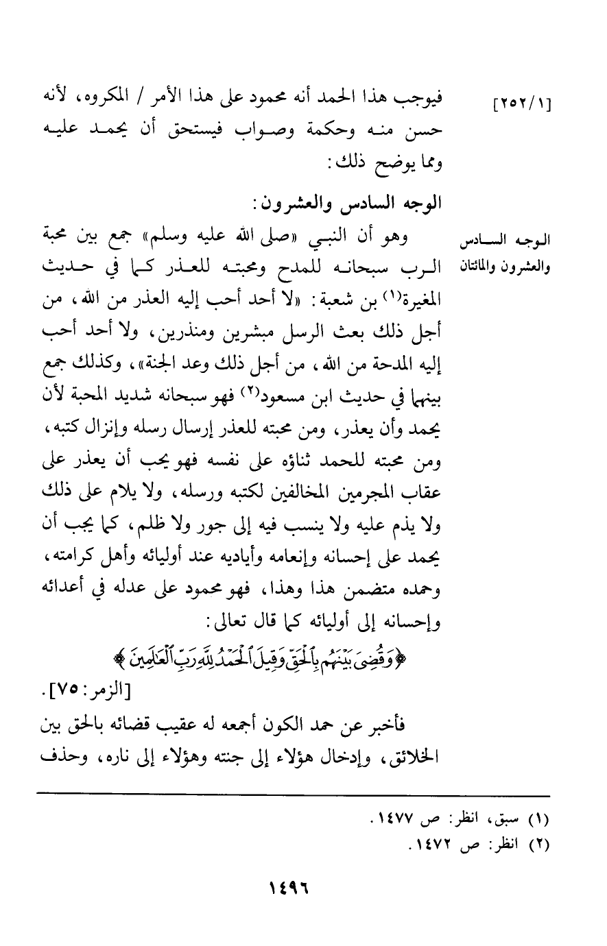 الوجه السادس والعشرون والمائتان: وهو أن النبي جمع بين محبة الرب سبحانه للمدح ومحبته للعذر كما في حديث المغيرة بن شعبة "لا أحد أحب إليه العذر من الله من أجل ذلك بعث الرسل مبشرين ومنذرين ولا أحد أحب إليه المدحة من الله من أجل ذلك وعد الجنة" وكذلك جمع بينهما في حديث ابن مسعود فهو سبحانه شديد المحبة لأن يحمد وأن يعذر ومن محبته للعذر إرسال رسله وإنزال كتبه ومن محبته للحمد ثناؤه على نفسه فهو يحب أن يعذر على عقاب المجرمين المخالفين لكتبه ورسله ولا يلام على ذلك ولا يذم عليه ولا ينسب فيه إلى جور ولا ظلم كما يحب أن يحمد على إحسانه وإنعامه وأياديه عند أوليائه وأهل كرامته وحمده متضمن هذا وهذا فهو محمود على عدله في أعدائه وإحسانه إلى أوليائه كما قال تعالى {وَقُضِيَ بَيْنَهُمْ بِالْحَقِّ وَقِيلَ الْحَمْدُ لِلَّهِ رَبِّ الْعَالَمِينَ} [الزمر75] فأخبر عن حمد الكون أجمعه له عقيب قضائه بالحق بين الخلائق وإدخال هؤلاء إلى جنته وهؤلاء إلى ناره وحذف