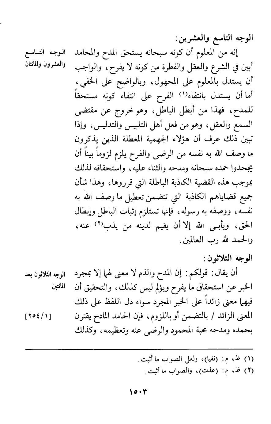 الوجه التاسع والعشرين والمائتان: إنه من المعلوم أن كونه سبحانه يستحق المدح والمحامد أبين في الشرع والعقل والفطرة من كونه لا يفرح والواجب أن يستدل بالمعلوم على المجهول وبالواضح على الخفي أما أن يستدل بانتفاء الفرح على انتفاء كونه مستحقا للمدح فهذا من أبطل الباطل وهو خروج عن مقتضى السمع والعقل وهو من فعل أهل التلبيس والتدليس وإذا تبين ذلك عرف أن هؤلاء الجهمية المعطلة الذي يذكرون ما وصف الله به نفسه من الرضى والفرح يلزم لزوما بينا أن يجحدوا حمده سبحانه ومدحه والثناء عليه واستحقاقه لذلك بموجب هذه القضية الكاذبة الباطلة التي قرروها وهذا شأن جميع قضاياهم الكاذبة التي تتضمن تعطيل ما وصف الله به نفسه ووصفه به رسوله فإنها تستلزم إثبات الباطل وإبطال الحق ويأبى الله إلا أن يقيم لدينه من يذب عنه والحمد لله رب العالمين.