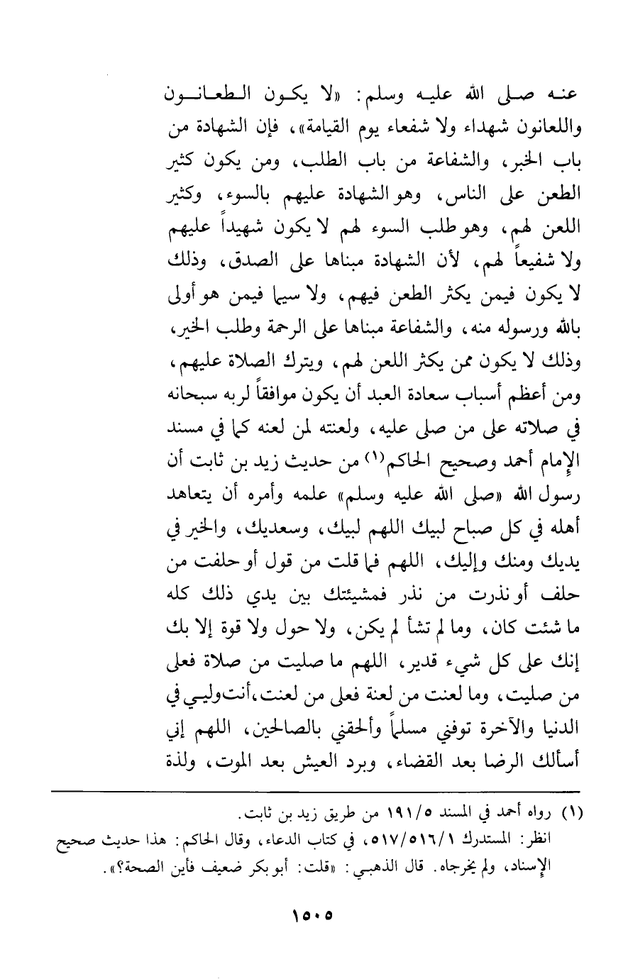 عنه صلى الله عليه وسلم: "لا يكون الطعانون واللعانون شهداء ولا شفعاء يوم القيامة" فإن الشهادة من باب الخبر والشفاعة من باب الطلب ومن يكون كثير الطعن على الناس وهو الشهادة عليهم بالسوء وكثير اللعن لهم وهو طلب السوء لهم لا يكون شهيدا عليهم ولا شفيعا لهم لأن الشهادة مبناها على الصدق وذلك لا يكون فيمن يكثر الطعن فيهم ولا سيما فيمن هو أولى بالله ورسوله منه والشفاعة مبناها على الرحمة وطلب الخير وذلك لا يكون ممن يكثر اللعن لهم ويترك الصلاة عليهم ومن أعظم أسباب سعادة العبد أن يكون موافقا لربه سبحانه في صلاته على من صلى عليه ولعنته لمن لعنه كما في مسند الإمام أحمد وصحيح الحاكم من حديث زيد بن ثابت أن رسول الله صلى الله عليه وسلم علمه وأمره أن يتعاهد أهله في كل صباح لبيك اللهم لبيك وسعديك والخير في يديك ومنك وإليك اللهم فما قلت من قول أو حلفت من حلف أو نذرت من نذر فمشيئتك بين يدي ذلك كله ما شئت كان وما لم تشأ لم يكن ولا حول ولا قوة إلا بك إنك على كل شيء قدير اللهم ما صليت من صلاة فعلى من صليت وما لعنت من لعنة فعلى من لعنت أنت وليي في الدنيا والآخرة توفني مسلما وألحقني بالصالحين اللهم إني أسألك الرضا بعد القضاء وبرد العيش بعد الموت ولذة