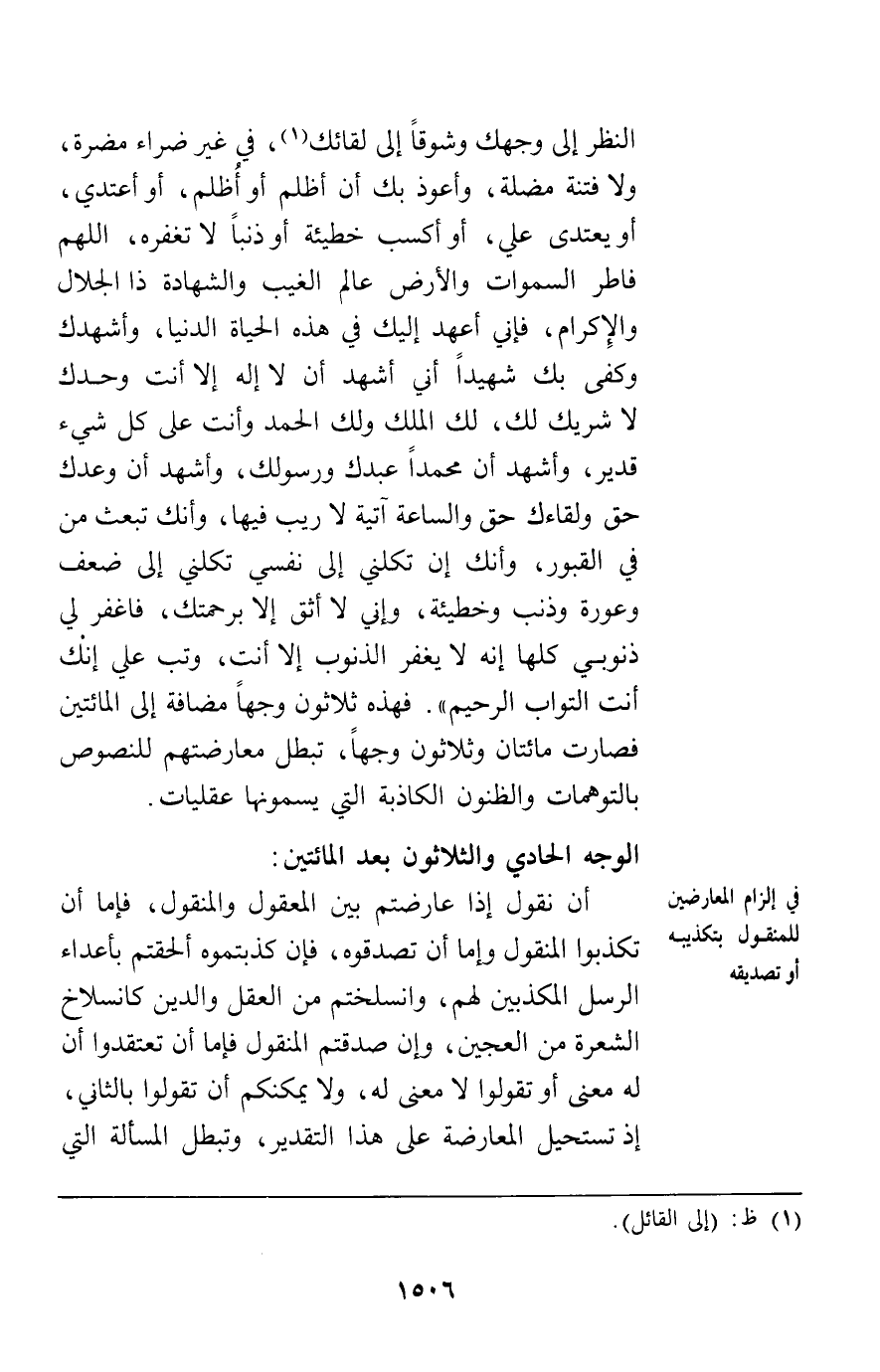النظر إلى وجهك وشوقا إلى لقائك في غير ضراء مضرة ولا فتنة مضلة وأعوذ بك فأن أظلم أو أظلم أو أعتدي أو يعتدى علي أو أكسب خطيئة أو ذنبا لا تغفره اللهم فاطر السموات والأرض عالم الغيب والشهادة ذا الجلال والإكرام فإني أعهد إليك في هذه الحياة الدنيا وأشهدك وكفى بك شهيدا أني أشهد أن لا إله إلا أنت وحدك لا شريك لك لك الملك ولك الحمد وأنت على كل شيء قدير وأشهد أن محمدا عبدك ورسولك وأشهد أن وعدك حق ولقاءك حق والساعة آتية لا ريب فيها وأنك تبعث من في القبور وأنك إن تكلني إلى نفسي تكلني إلى ضعف وعورة وذنب وخطيئة وإني لا أثق إلا برحمتك فاغفر لي ذنوبي كلها إنه لا يغفر الذنوب إلا أنت وتب علي إنك أنت التواب الرحيم" فهذه ثلاثون وجها مضافة إلى المائتين فصارت مائتين وثلاثين وجها تبطل معارضتهم للنصوص بالتوهمات والظنون الكاذبة التي يسمونها عقليات.