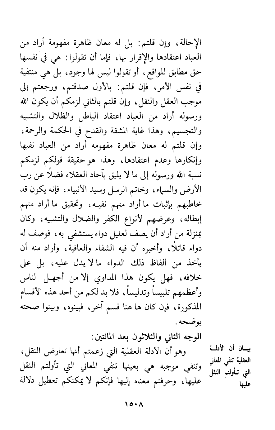 الوجه الثاني والثلاثون بعد المائتين: وهو أن الأدلة العقلية التي زعمتم أنها تعارض النقل وتنفي موجبه هي بعينها تنفي المعاني التي تأولتم النقل عليها وحرفتم معناه إليها فإنكم لا يمكنكم تعطيل دلالة