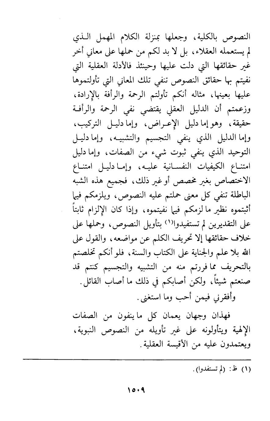 فهذان وجهان يعمان كل ما ينفون من الصفات الإلهية ويتأولونه على غير تأويله من النصوص النبوية ويعتمدون عليه من الأقيسة العقلية.