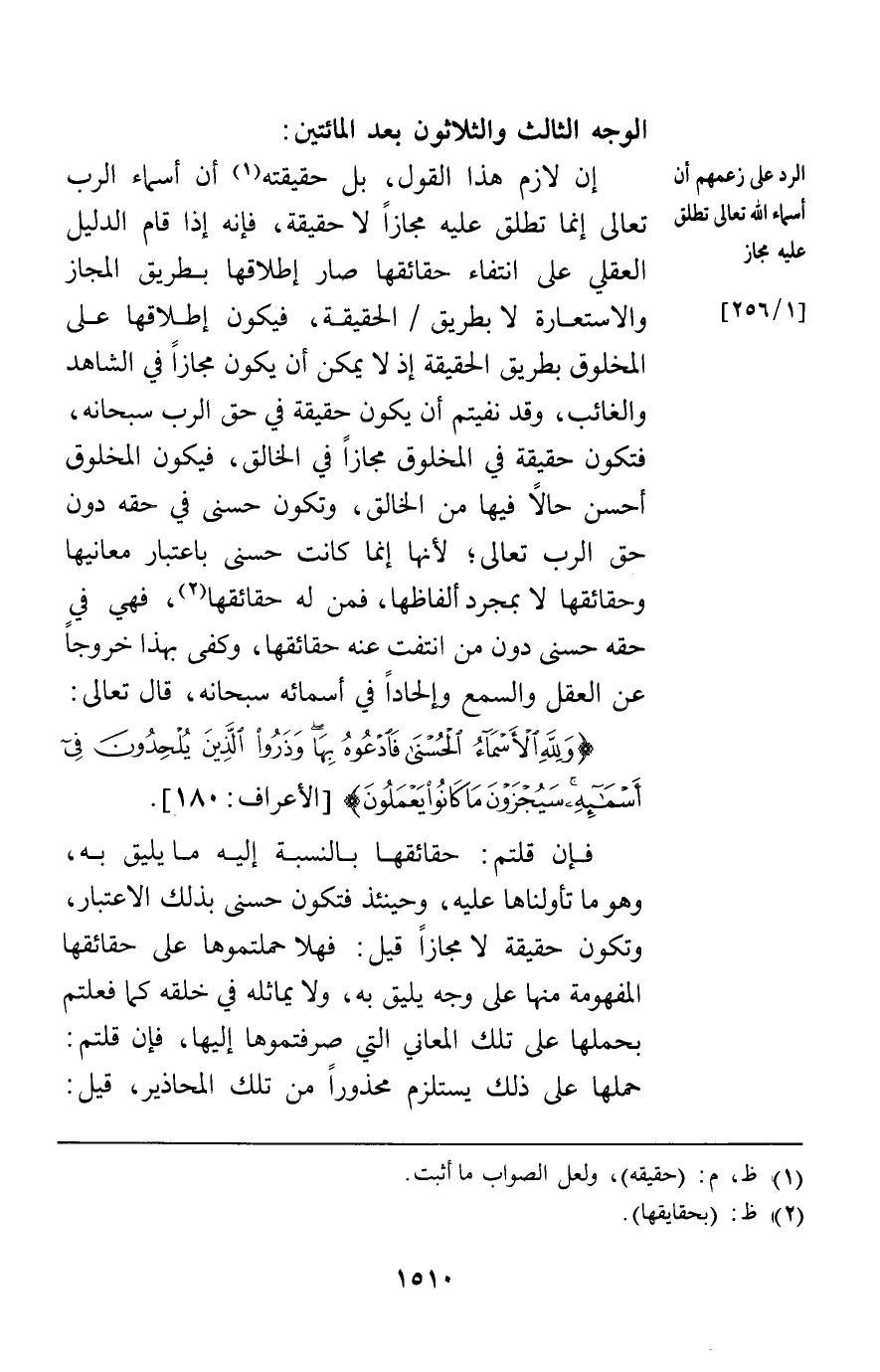 الوجه الثالث والثلاثون بعد المائتين: إن لازم هذا القول بل حقيقته أن أسماء الرب تعالى إنما تطلق عليه مجازا لا حقيقة فإنه إذا قام الدليل العقلي على انتفاء حقائقها صار إطلاقها بطريق المجاز والاستعارة لا بطيق الحقيقة فيكون إطلاقها على المخلوق بطريق الحقيقة إذ لا يمكن أن يكون مجازا في الشاهد والغائب وقد نفيتم أن يكون حقيقة في حق الرب سبحانه فتكون حقيقة في المخلوق مجازا في الخالق فيكون المخلوق أحسن حالا فيها من الخالق وتكون حسنى في حقه دون حق الرب تعالى لأنها إنما كانت حسنى باعتبار معانيها وحقائقها لا بمجرد ألفاظها فمن له حقائقها فهي في حقه حسنى دون من انتفت عنه حقائقها وكفى بهذا خروجا عن العقل والسمع وإلحادا في أسمائه سبحانه قال تعالى {وَلِلَّهِ الأَسْمَاءُ الْحُسْنَى فَادْعُوهُ بِهَا وَذَرُوا الَّذِينَ يُلْحِدُونَ فِي أَسْمَائِهِ سَيُجْزَوْنَ مَا كَانُوا يَعْمَلُونَ} [الأعراف180] فإن قلتم حقائقها بالنسبة إليه ما يليق به وهو ما تأولناها عليه وحينئذ فتكون حسنى بذلك الاعتبار وتكون حقيقة لا مجازا قيل فهلا حملتموها على حقائقها المفهومة منها على وجه يليق به ولا يماثله في خلقه كما فعلتم بحملها على تلك المعاني التي صرفتموها إليها فإن قلتم حملها على ذلك يستلزم محذورا من تلك المحاذير قيل