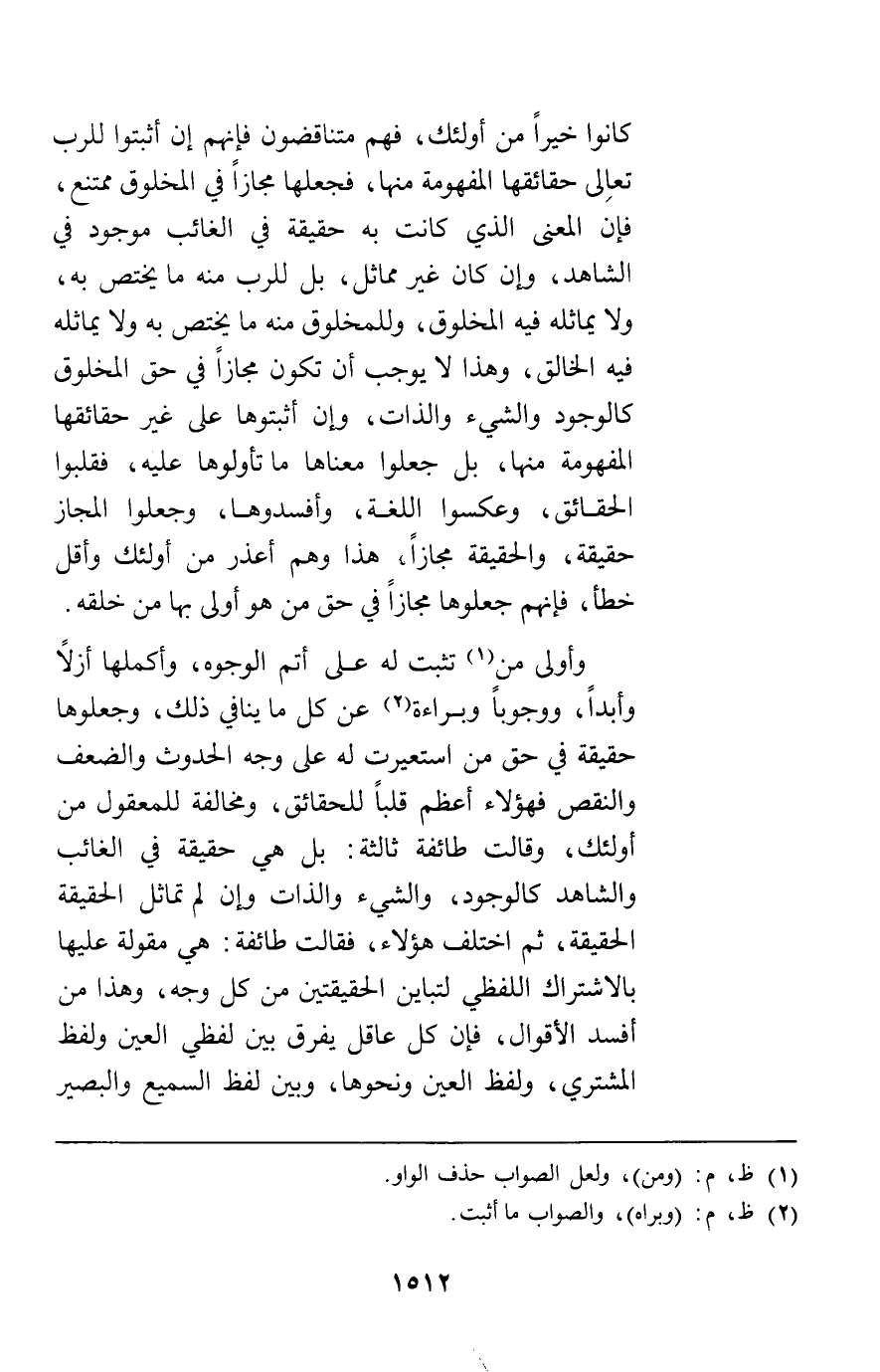 وأولى من تثبت له على أتم الوجوه وأكملها أزلا وأبدا ووجوبا وبراءة عن كل ما ينافي ذلك وجعلوها حقيقة في حق من استعيرت له على وجه الحدوث والضعف والنقص فهؤلاء أعظم قلبا للحقائق ومخالفة للمعقول من أولئك وقالت طائفة ثالثة بل هي حقيقة في الغائب والشاهد كالوجود والشيء والذات وإن لم تماثل الحقيقة الحقيقة ثم اختلف هؤلاء فقالت طائفة هي مقولة عليها بالاشتراك اللفظي لتباين الحقيقتين من كل وجه وهذا من أفسد الأقوال فإن كل عاقل يفرق بين لفظي العين ولفظ المشتري ولفظ العين ونحوها وبين لفظ السميع والبصير