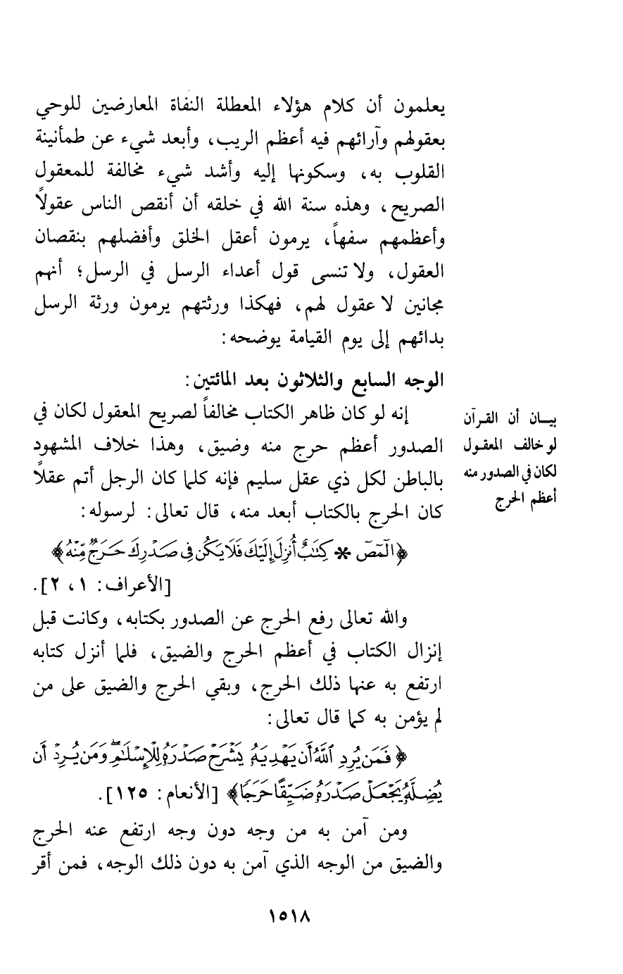 الوجه السابع والثلاثون بعد المائتين: إنه لو كان ظاهر الكتاب مخالفا لصريح المعقول لكان في الصدور أعظم حرج منه وضيق وهذا خلاف المشهود بالباطن لكل ذي عقل سليم فإنه كلما كان الرجل أتم عقلا كان الحرج بالكتاب أبعد منه قال تعالى لرسوله {المص كِتَابٌ أُنْزِلَ إِلَيْكَ فَلا يَكُنْ فِي صَدْرِكَ حَرَجٌ مِنْهُ} [الأعراف2 , 1] والله تعالى رفع الحرج عن الصدور بكتابه وكانت قبل إنزال الكتاب في أعظم الحرج والضيق فلما أنزل كتابه ارتفع به عنها ذلك الحرج وبقي الحرج والضيق على من لم يؤمن به كما قال تعالى {فَمَنْ يُرِدِ اللَّهُ أَنْ يَهْدِيَهُ يَشْرَحْ صَدْرَهُ لِلإِسْلامِ وَمَنْ يُرِدْ أَنْ يُضِلَّهُ يَجْعَلْ صَدْرَهُ ضَيِّقاً حَرَجاً} [الأنعام125] ومن آمن به من وجه دون وجه ارتفع عنه الحرج والضيق من الوجه الذي آمن به دون ذلك الوجه فمن أقر