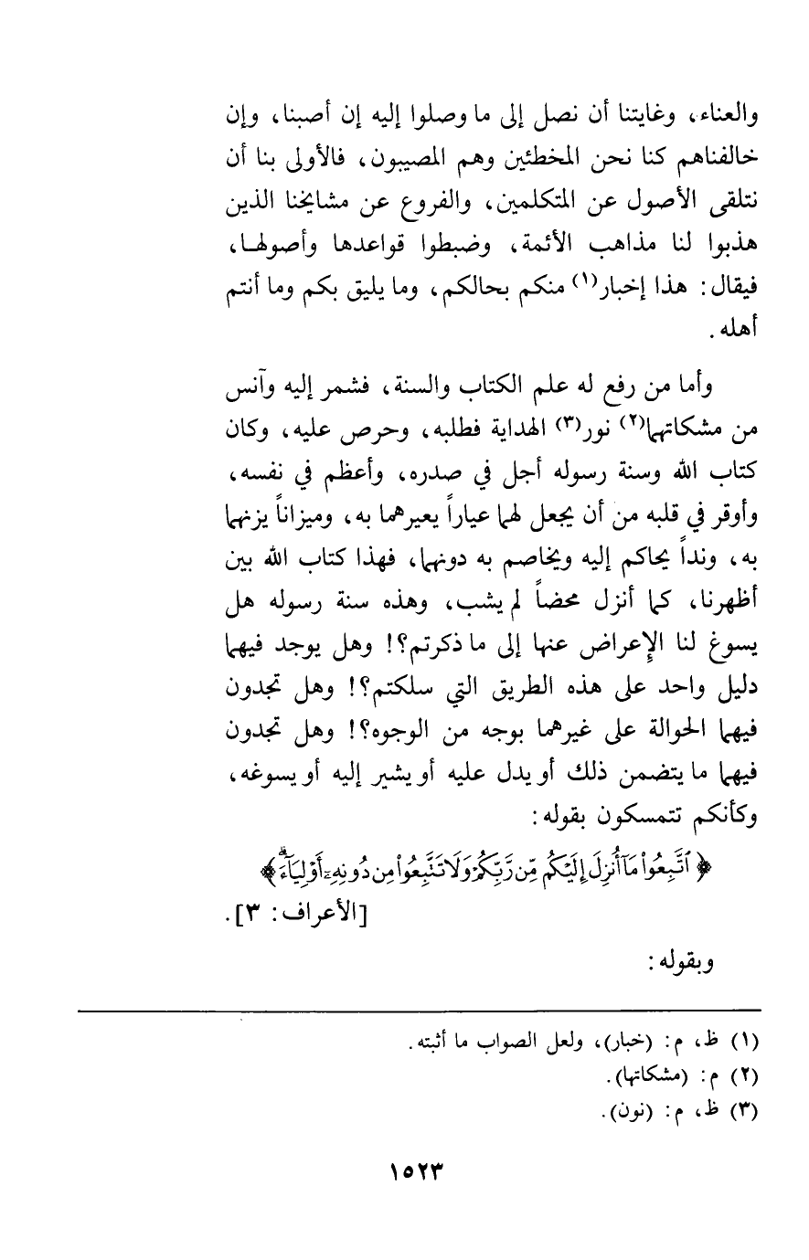 وأما من رفع له علم الكتاب والسنة فشمر إليه وآنس من مشكاتهما نور الهداية فطله وحرص عليه وكان كتاب الله وسنة رسوله أجل في صدره وأعظم في نفسه وأوقر في قلبه من أن يجعل لهما عيارا يعيرهما به وميزانا يزنهما به وندا يحاكم إليه ويخاصم به دونهما فهذا كتاب الله بين أظهرنا كما أنزل محضا لم يشب وهذه سنة رسوله هل يسوغ لنا الإعراض عنها إلى ما ذكرتم وهل يوجد فيهما دليل واحد على هذه الطريق التي سلكتم وهل تجدون فيهما الحوالة على غيرهما بوجه من الوجوه وهل تجدون فيهما ما يتضمن ذلك أو يدل عليه أو يشير إليه أو يسوغه وكأنكم تتمسكون بقوله {اتَّبِعُوا مَا أُنْزِلَ إِلَيْكُمْ مِنْ رَبِّكُمْ وَلا تَتَّبِعُوا مِنْ دُونِهِ أَوْلِيَاءَ} [الأعراف3] وبقوله