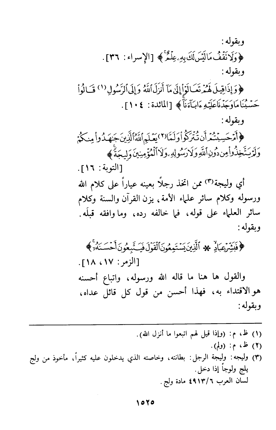 وبقوله {وَلا تَقْفُ مَا لَيْسَ لَكَ بِهِ عِلْمٌ} [الإسراء36] وبقوله {وَإِذَا قِيلَ لَهُمْ تَعَالَوْا إِلَى مَا أَنْزَلَ اللَّهُ وَإِلَى الرَّسُولِ قَالُوا حَسْبُنَا مَا وَجَدْنَا عَلَيْهِ آبَاءَنَا} [المائدة104] وبقوله {أَمْ حَسِبْتُمْ أَنْ تُتْرَكُوا وَلَمَّا يَعْلَمِ اللَّهُ الَّذِينَ جَاهَدُوا مِنْكُمْ وَلَمْ يَتَّخِذُوا مِنْ دُونِ اللَّهِ وَلا رَسُولِهِ وَلا الْمُؤْمِنِينَ وَلِيجَةً} [التوبة16] أي وليجة ممن اتخذ رجلا بعينه عيارا على كلام الله ورسوله وكلام سائر علماء الأمة يزن القرآن والسنة وكلام سائر العلماء على قوله فما خالفه رده وما وافقه قبله وبقوله {فَبَشِّرْ عِبَادِ لَّذِينَ يَسْتَمِعُونَ الْقَوْلَ فَيَتَّبِعُونَ أَحْسَنَهُ} [الزمر18 , 17] والقول ها هنا ما قاله الله ورسوله واتباع أحسنه هو الاقتداء به فهذا أحسن من قول كل قائل عداه وبقوله