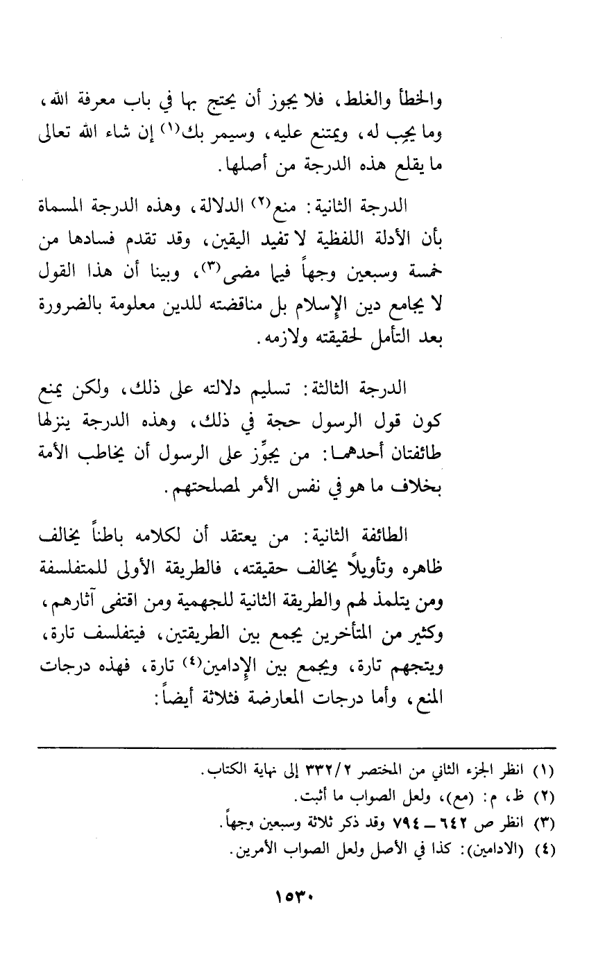 الدرجة الثانية منع الدلالة وهذه الدرجة المسماة بأن الأدلة اللفظية لا تفيد اليقين وقد تقدم فسادها من خمسة وسبعين وجها فيما مضى وبينا أن هذا القول لا يجامع دين الإسلام بل مناقضته للدين معلومة بالضرورة بعد التأمل لحقيقته ولازمه.