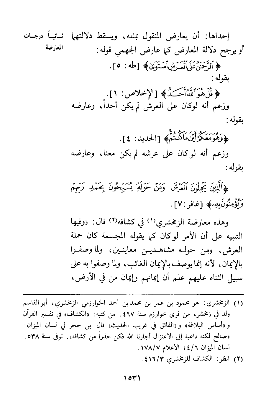 إحداها أن يعارض المنقول بمثله ويسقط دلالتهما أو يرجح دلالة المعارض كما عارض الجهمي قوله {الرَّحْمَنُ عَلَى الْعَرْشِ اسْتَوَى} [طه5] بقوله {قُلْ هُوَ اللَّهُ أَحَدٌ} [الإخلاص1] وزعم أنه لو كان على العرش لم يكن أحدا وعارضه بقوله {وَهُوَ مَعَكُمْ أَيْنَ مَا كُنْتُمْ} [الحديد4] وزعم أنه لو كان على عرشه لم يكن معنا وعارضه بقوله {الَّذِينَ يَحْمِلُونَ الْعَرْشَ وَمَنْ حَوْلَهُ يُسَبِّحُونَ بِحَمْدِ رَبِّهِمْ وَيُؤْمِنُونَ بِهِ} [غافر7] وهذه معارضة الزمخشري في كشافه قال وفيها التنبيه على أن الأمر لو كان كما يقوله المجسمة كان حملة العرش ومن حوله مشاهدين معاينين ولما وصفوا بالإيمان لأنه إنما يوصف بالإيمان الغائب ولما وصفوا به على سبيل الثناء عليهم علم أن إيمانهم وإيمان من في الأرض