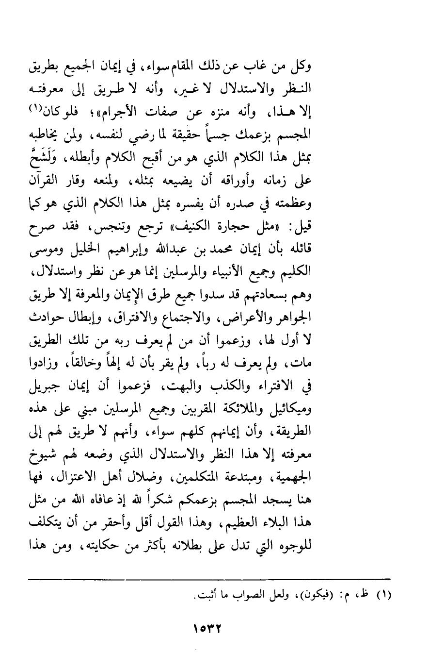 وكل من غاب عن ذلك المقام سواء في إيمان الجميع بطريق النظر والاستدلال لا غير وأنه لا طريق إلى معرفته إلا هذا وأنه منزه عن صفات الأجرام فلو كان المجسم بزعمك جسما حقيقة لما رضي لنفسه ولمن يخاطبه بمثل هذا الكلام الذي هو من أقبح الكلام وأبطله ولشح على زمانه وأوراقه أن يضيعه بمثله ولمنعه وقار القرآن وعظمته في صدره أن يفسره بمثل هذا الكلام الذي هو كما قيل مثل حجارة الكنيف ترجع وتنجس فقد صرح قائله بأن إيمان محمد بن عبد الله وإبراهيم الخليل وموسى الكليم وجميع الأنبياء والمرسلين إنما هو عن نظر واستدلال وهم بسعادتهم قد سدوا جميع طرق الإيمان والمعرفة إلا طريق الجواهر والأعراض والاجتماع والافتراق وإبطال حوادث لا أول لها وزعموا أن من لم يعرف ربه من تلك الطريق مات ولم يعرف له ربا ولم يقر بأن له إلها وخالقا وزادوا في الافتراء والكذب والبهت فزعموا أن إيمان جبريل وميكائيل والملائكة المقربين وجميع المرسلين مبني على هذه الطريقة وأن إيمانهم كلهم سواء وأنهم لا طريق لهم إلى معرفته إلا هذا النظر والاستدلال الذي وضعه لهم شيوخ الجهمية ومبتدعة المتكلمين وضلال أهل الاعتزال فها هنا يسجد المجسم بزعمكم شكرا لله إذ عافاه الله من مثل هذا البلاء العظيم وهذا القول أقل وأحقر من أن يتكلف للوجوه التي تدل على بطلانه بأكثر من حكايته ومن هذا