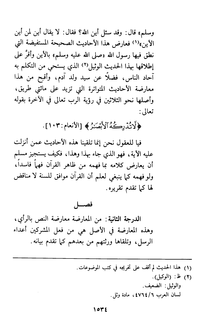 قال وقد سئل أين الله فقال " لا يقال أين لمن أين الأين" فعارض هذا الأحاديث الصحيحة المستفيضة التي نطق فيها رسول الله صلى الله عليه وسلم بالأين وأقر على إطلاقها بهذا الحديث الوثيل الذي يستحي من التكلم به آحاد الناس فضلا عن سيد ولد آدم وأقبح من هذا معارضة الأحاديث المتواترة التي تزيد على مائتي طريق وأصلها نحو الثلاثين في رؤية الرب تعالى في الآخرة بقوله تعالى {لا تُدْرِكُهُ الأَبْصَارُ} [الأنعام103] فيا للعقول نحن إنما تلقينا هذه الأحاديث عمن أنزلت عليه الآية فهو الذي جاء بهذا وهذا فكيف يستجيز مسلم أن يعارض كلامه بما فهمه من ظاهر القرآن فهما فاسدا ولو فهمه كما ينبغي لعلم أن القرآن موافق للسنة لا مناقض لها كما تقدم تقريره.