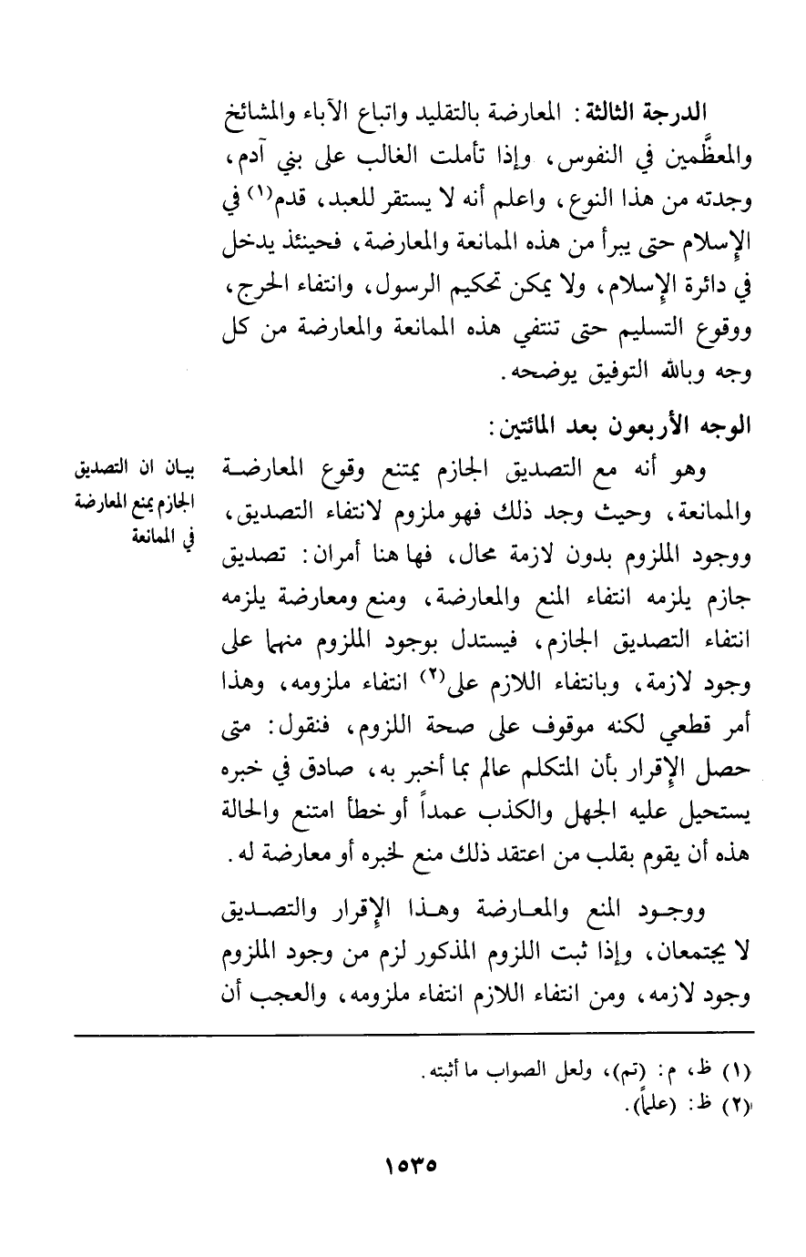 الوجه الأربعون بعد المائتين: وهو أنه مع التصديق الجازم يمتنع وقوع المعارضة والممانعة وحيث وجد ذلك فهو ملزوم لانتفاء التصديق ووجود الملزوم بدون لازمه محال فها هنا أمران تصديق جازم يلزمه انتفاء المنع والمعارضة ومنع ومعارضة يلزمه انتفاء التصديق الجازم فيستدل بوجود الملزوم منهما على وجود لازمة وبانتفاء اللازم على انتفاء ملزومه وهذا أمر قطعي لكنه موقوف على صحة اللزوم فنقول متى حصل الإقرار بأن المتكلم عالم بما أخبر به صادق في خبره يستحيل عليه الجهل والكذب عمدا أو خطأ امتنع والحالة هذه أن يقوم بقلب من اعتقد ذلك منع لخبره أو معارضة له.