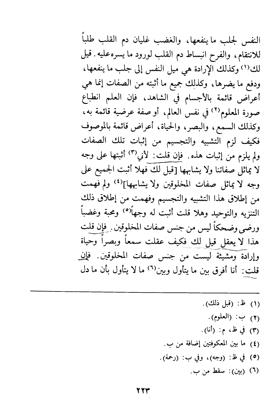 النفس لجلب ما ينفعها والغضب غليان دم القلب طلبا للانتقام والفرح انبساط دم القلب لورود ما يسره عليه قيل لك وكذلك الإرادة هي ميل النفس إلى جلب ما ينفعها ودفع ما يضرها وكذلك جميع ما أثبته من الصفات إنما هي أعراض قائمة بالأجسام في الشاهد فإن العلم انطباع صورة المعلوم في نفس العالم أو صفة عرضية قائمة به وكذلك السمع والبصر والحياة أعراض قائمة بالموصوف فكيف لزم التشبيه والتجسيم من إثبات تلك الصفات ولم يلزم من إثبات هذه فإن قلت لأني أثبتها على وجه لا يماثل صفاتنا ولا يشابهها قيل لك فهلا أثبت الجميع على وجه لا يماثل صفات المخلوقين ولا يشابهها ولم فهمت من إطلاق هذا التشبيه والتجسيم وفهمت من إطلاق ذلك التنزيه والتوحيد وهلا قلت أثبت له وجها ومحبة وغضبا ورضى وضحكا ليس من جنس صفات المخلوقين فإن قلت هذا لا يعقل قيل لك فكيف عقلت سمعا وبصرا وحياة وإرادة ومشيئة ليست من جنس صفات المخلوقين فإن قلت أنا أفرق بين ما يتأول وبين ما لا يتأول بأن ما دل
