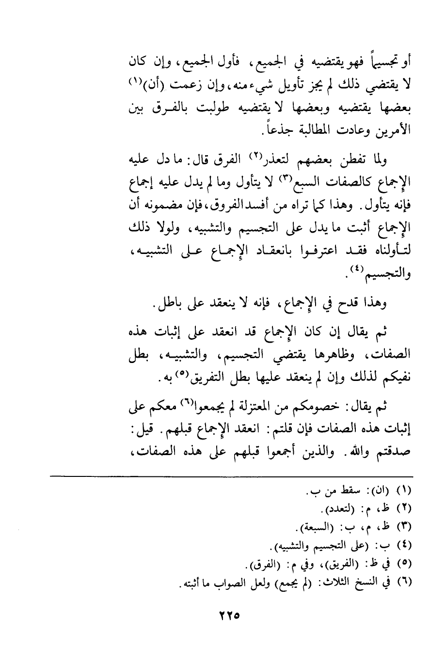 ثم يقال إن كان الإجماع قد انعقد على إثبات هذه الصفات وظاهرها يقتضي التجسيم والتشبيه بطل نفيكم لذلك وإن لم ينعقد عليها بطل التفريق به.