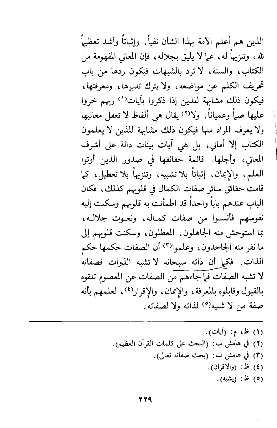 الذين هم أعلم الأمة بهذا الشأن نفيا وإثباتا وأشد تعظيما لله وتنزيها له عما لا يليق بجلاله فإن المعاني المفهومة من الكتاب والسنة لا ترد بالشبهات فيكون ردها من باب تحريف الكلم عن مواضعه ولا يترك تدبرها ومعرفتها فيكون ذلك مشابهة للذين إذا ذكروا بآيات ربهم خروا عليها صما وعميانا ولا يقال هي ألفاظ لا تعقل معانيها ولا يعرف المراد منها فيكون ذلك مشابهة للذين لا يعلمون الكتاب إلا أماني بل هي آيات بينات دالة على أشرف المعاني وأجلها قائمة حقائقها في صدور الذين أوتوا العلم والإيمان إثباتا بلا تشبيه وتنزيها بلا تعطيل كما قامت حقائق سائر صفات الكمال في قلوبهم كذلك فكان الباب عندهم بابا واحدا قد اطمأنت به قلوبهم وسكنت إليه نفوسهم فأنسوا من صفات كماله ونعوت جلاله بما استوحش منه الجاهلون المعطلون وسكنت قلوبهم إلى ما نفر منه الجاحدون وعلموا أن الصفات حكمها حكم الذات فكما أن ذاته سبحانه لا تشبه الذوات فصفاته لا تشبه الصفات فما جاءهم من الصفات عن المعصوم تلقوه بالقبول وقابلوه بالمعرفة والإيمان والإقرار لعلمهم بأنه صفة من لا شبيه لذاته ولا لصفاته.