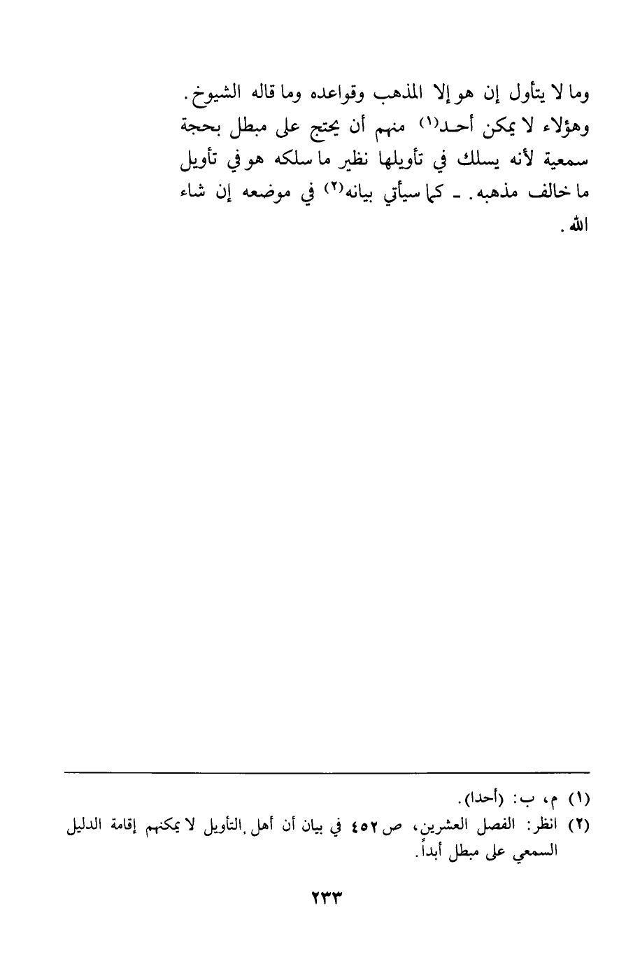 وما لا يتأول إن هو إلا المذهب وقواعده وما قاله الشيوخ وهؤلاء لا يمكن أحدا منهم أن يحتج على مبطل بحجة سمعية لأنه يسلك في تأويلها نظير ما سلكه هو في تأويل ما خالف مذهبه كما سيأتي بيانه في موضعه إن شاء الله.