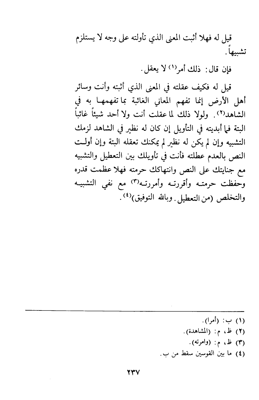 قيل له فكيف عقلته في المعنى الذي أثبته وأنت وسائر أهل الأرض إنما تفهم المعاني الغائبة بما تفهمها به في الشاهد ولولا ذلك لما عقلت أنت ولا أحد شيئا غائبا البتة فما أبديته في التأويل إن كان له نظير في الشاهد لزمك التشبيه وإن لم يكن له نظير لم يمكنك تعقله البتة وإن أولت النص بالعدم عطلته فأنت في تأويلك بين التعطيل والتشبيه مع جنايتك على النص وانتهاكك حرمته فهلا عظمت قدره وحفظت حرمته وأقررته وأمررته مع نفي التشبيه والتخلص من التعطيل وبالله التوفيق.