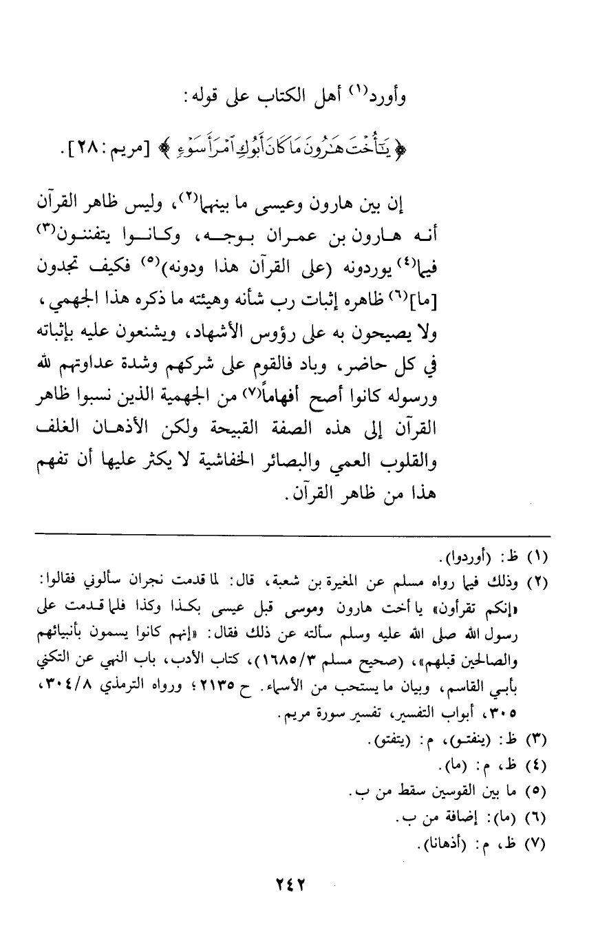 وأورد أهل الكتاب على قوله {يَا أُخْتَ هَارُونَ مَا كَانَ أَبُوكِ امْرَأَ سَوْءٍ} [مريم28] إن بين هارون عيسى ما بينهما وليس ظاهر القرآن أنه هارون بن عمران بوجه وكانوا يتفننون فيما يوردونه على القرآن هذا ودونه فكيف يجدون ما ظاهره إثبات رب شأنه وهيئته ما ذكره هذا الجهمي ولا يصيحون به على رؤوس الأشهاد ويشنعون عليه بإثباته في كل حاضر وباد فالقوم على شركهم وشدة عدواتهم لله ورسوله كانوا أصح أفهاما من الجهمية الذين نسبوا ظاهر القرآن إلى هذه الصفة القبيحة ولكن الأذهان الغلف والقلوب العمي والبصائر الخفاشية لا يكثر عليها أن تفهم هذا من ظاهر القرآن.