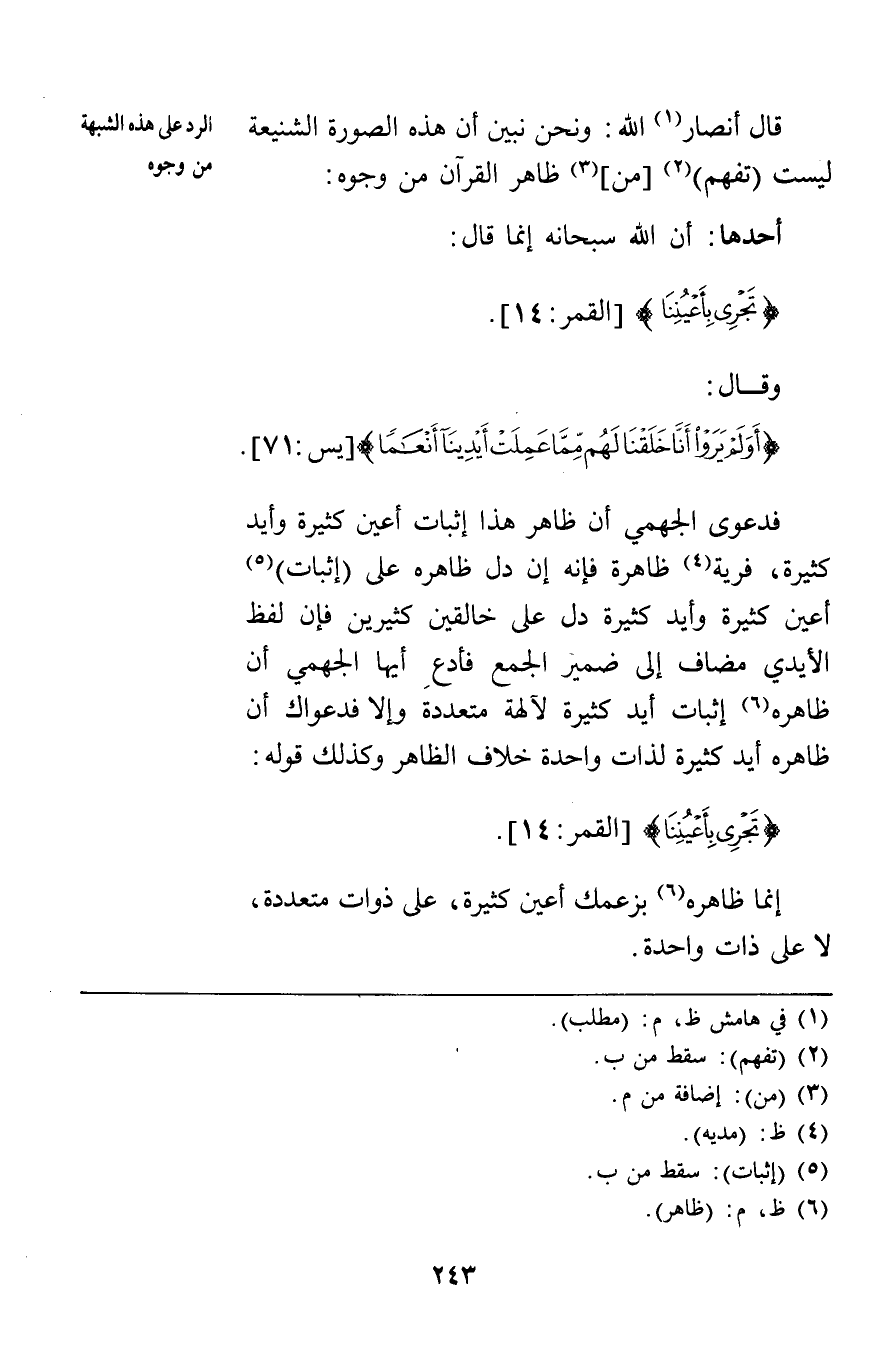 أحدها: أن الله سبحانه إنما قال: {تَجْرِي بِأَعْيُنِنَا} [القمر14] وقال: {أَوَلَمْ يَرَوْا أَنَّا خَلَقْنَا لَهُمْ مِمَّا عَمِلَتْ أَيْدِينَا أَنْعَاماً} [يس71] فدعوى الجهمي أن ظاهر هذا إثبات أعين كثيرة وأيد كثيرة فرية ظاهرة فإنه إن دل ظاهره على إثبات أعين كثيرة وأيد كثيرة دل على خالقين كثيرين فإن لفظ الأيدي مضاف إلى ضمير الجمع فأدع أيها الجهمي أن ظاهره إثبات أيد كثيرة لآلهة متعددة وإلا فدعواك أن ظاهره أيد كثيرة لذات واحدة خلاف الظاهر وكذلك قوله: {تَجْرِي بِأَعْيُنِنَا} [القمر14] إنما ظاهره بزعمك أعين كثيرة على ذوات متعددة لا على ذات واحدة.