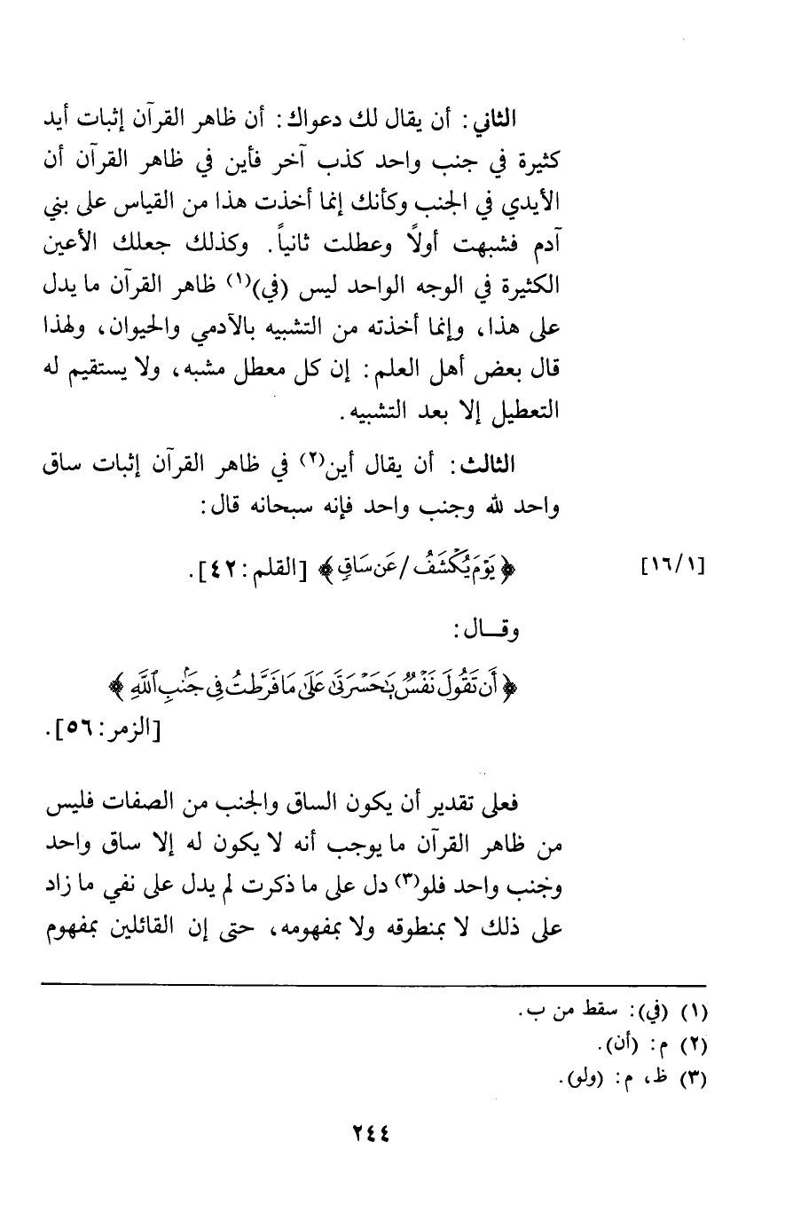 الثالث: أن يقال أين في ظاهر القرآن إثبات ساق واحد لله وجنب واحد فإنه سبحانه قال {يَوْمَ يُكْشَفُ عَنْ سَاقٍ} [القلم42] وقال {أَنْ تَقُولَ نَفْسٌ يَا حَسْرَتَى عَلَى مَا فَرَّطْتُ فِي جَنْبِ اللَّهِ} [الزمر56] فعلى تقدير أن يكون الساق والجنب من الصفات فليس من ظاهر القرآن ما يوجب أنه لا يكون له إلا ساق واحد وجنب واحد فلو دل على ما ذكرت لم يدل على نفي ما زاد على ذلك لا بمنطوقه ولا بمفهومه حتى إن القائلين بمفهوم