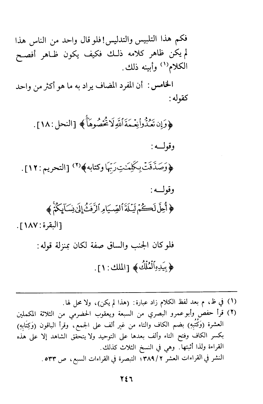 الخامس: أن المفرد المضاف يراد به ما هو أكثر من واحد كقوله {وَإِنْ تَعُدُّوا نِعْمَةَ اللَّهِ لا تُحْصُوهَا} [النحل18] وقوله {وَصَدَّقَتْ بِكَلِمَاتِ رَبِّهَا وَكُتُبِهِ} [التحريم12] وقوله {أُحِلَّ لَكُمْ لَيْلَةَ الصِّيَامِ الرَّفَثُ إِلَى نِسَائِكُمْ} [البقرة187] فلو كان الجنب والساق صفة لكان بمنزلة قوله {بِيَدِهِ الْمُلْكُ} [الملك1]