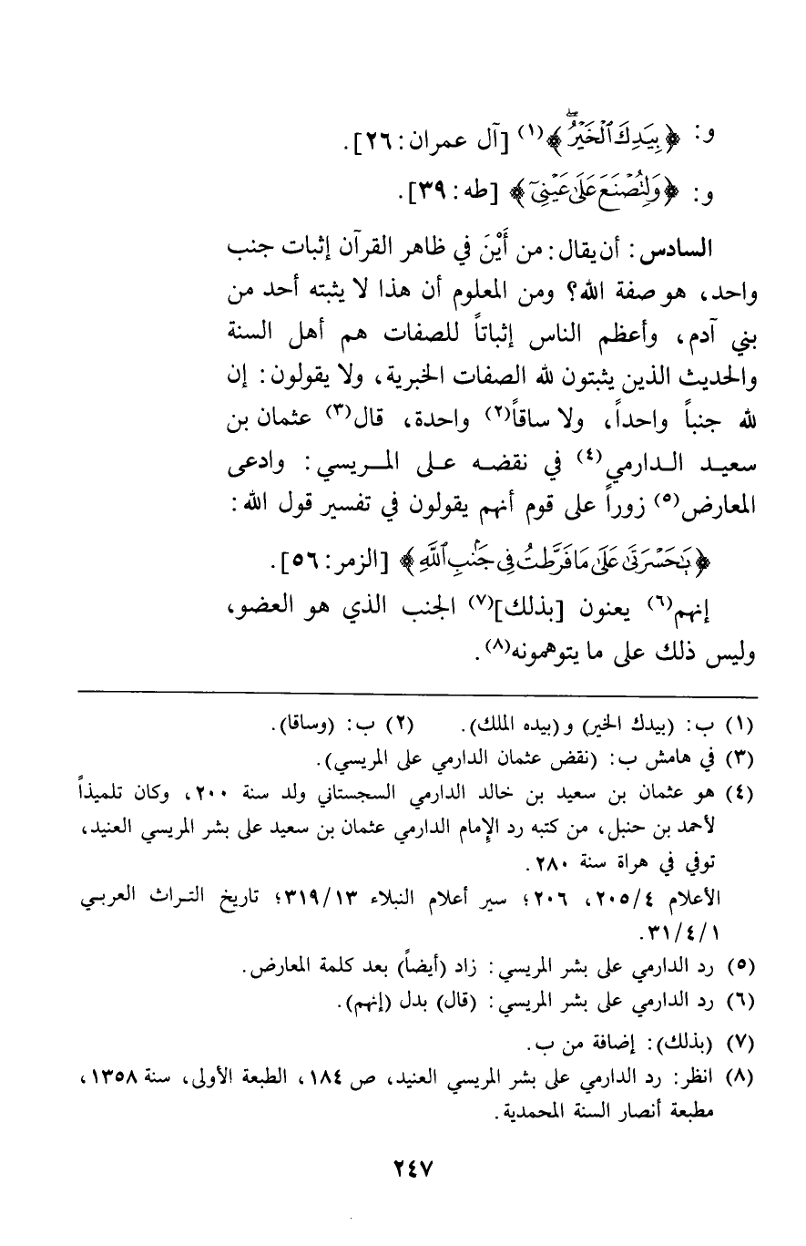 و {بيدك الخير} [آل عمران26] و {وَلِتُصْنَعَ عَلَى عَيْنِي} [طه39] السادس أن يقال من أين في ظاهر القرآن إثبات جنب واحد هو صفة الله ومن المعلوم أن هذا لا يثبته أحد من بني آدم وأعظم الناس إثباتا للصفات هم أهل السنة والحديث الذي يثبتون لله الصفات الخبرية ولا يقولون إن لله جنبا واحدا ولا ساقا واحدة قال عثمان بن سعيد الدارمي في نقضه على المريسي وادعى المعارض زورا على قوم أنهم يقولون في تفسير قول الله {يَا حَسْرَتَى عَلَى مَا فَرَّطْتُ فِي جَنْبِ الله} [الزمر56] إنهم يعنون بذلك الجنب الذي هو العضو وليس ذلك على ما يتوهمونه.
