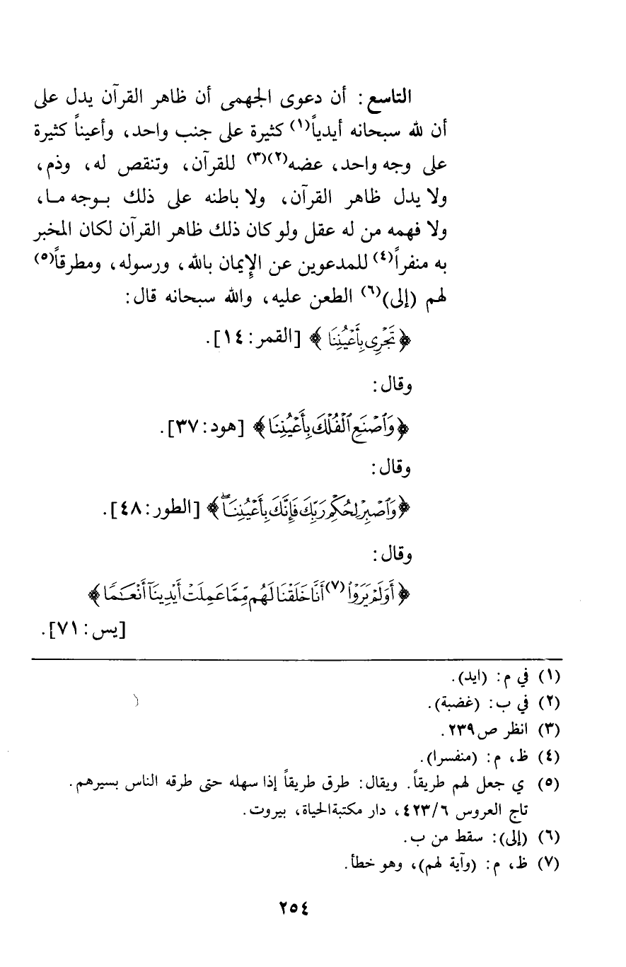 التاسع: أن دعوى الجهمي أن ظهر القرآن يدل على أن لله سبحانه أيديا كثيرة على جنب واحد وأعينا كثيرة على وجه واحد عضه للقرآن وتنقص له وذم ولا يدل ظاهر القرآن ولا باطنه على ذلك بوجه ما ولا فهمه من له عقل ولو كان ذلك ظاهر القرآن لكان المخبر به منفرا للمدعوين عن الإيمان بالله ورسوله ومطرقا لهم إلى الطعن عليه والله سبحانه قال {تَجْرِي بِأَعْيُنِنَا} [القمر14] وقال {وَاصْنَعِ الْفُلْكَ بِأَعْيُنِنَا} [هود37] وقال {وَاصْبِرْ لِحُكْمِ رَبِّكَ فَإِنَّكَ بِأَعْيُنِنَا} [الطور48] وقال {أَوَلَمْ يَرَوْا أَنَّا خَلَقْنَا لَهُمْ مِمَّا عَمِلَتْ أَيْدِينَا أَنْعَاماً} [يس71]