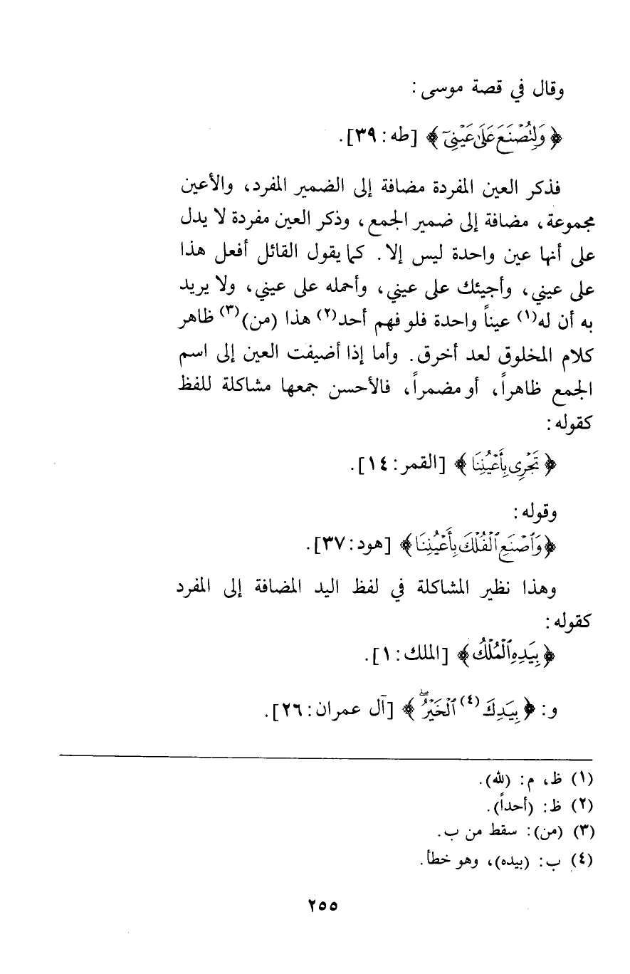 وقال في قصة موسى {وَلِتُصْنَعَ عَلَى عَيْنِي} [طه39] فذكر العين المفردة مضافة إلى الضمير المفرد والأعين مجموعة مضافة إلى ضمير الجمع وذكر العين مفردة لا يدل على أنها عين واحدة ليس إلا كما يقول القائل أفعل هذا على عيني وأجيئك على عيني وأحمله على عيني ولا يريد به أن له عينا واحدة فلو فهم أحد هذا من ظاهر كلام المخلوق لعد أخرق وأما إذا أضيفت العين إلى اسم الجمع ظاهرا أو مضمرا فالأحسن جمعها مشاكلة للفظ كقوله {تَجْرِي بِأَعْيُنِنَا} [القمر14] وقوله {وَاصْنَعِ الْفُلْكَ بِأَعْيُنِنَا} [هود37] وهذا نظير المشاكلة في لفظ اليد المضافة إلى المفرد كقوله {بِيَدِهِ الْمُلْكُ} [الملك1] و {بِيَدِكَ الْخَيْرُ} [آل عمران26]